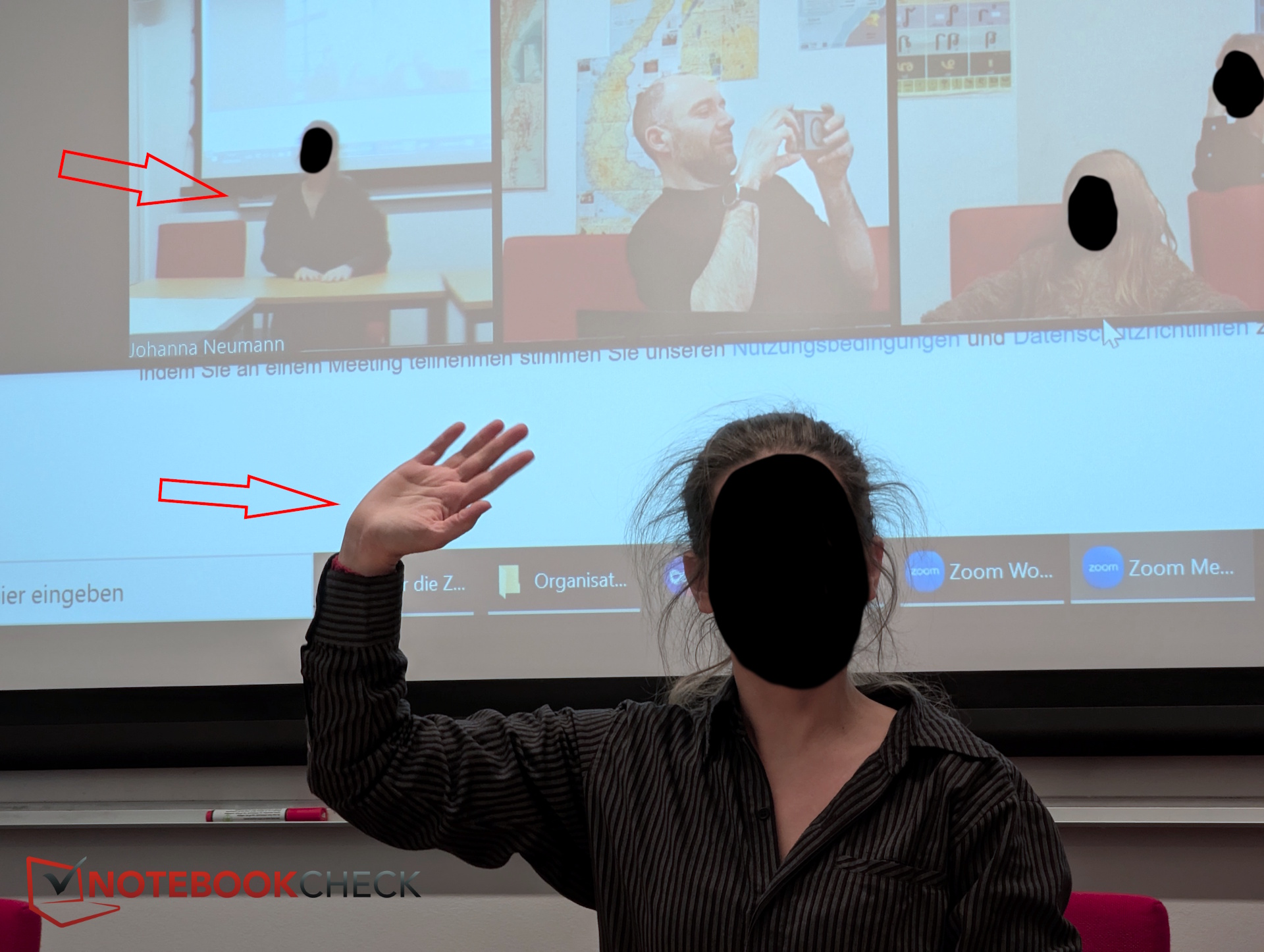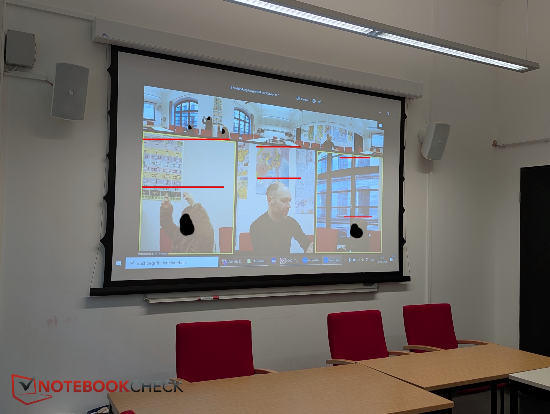 För ytterligare tester besökte vi Humboldt-universitetet i Berlin och utvärderade konferenshubben i ett seminarierum med flera deltagare som satt i olika positioner. Ytterligare en deltagare anslöt via Zoom-videosamtal.