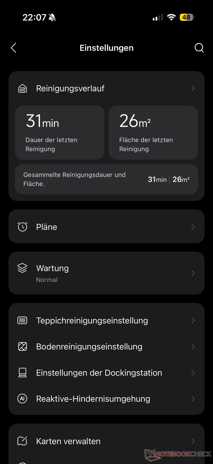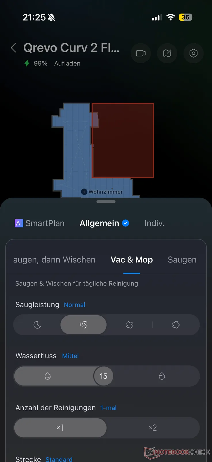 Som vanligt finns det många alternativ tillgängliga för rengöringsinställningarna, som vi redan känner till från Qrevo Curv 2 Pro och andra Roborock-modeller. Vi saknade dock ett läge för enbart torkning. Detta erbjuds inte, vilket enligt vår mening skulle vara meningsfullt för en robotdammsugare med fokus på moppningsprestanda. Istället kan Qrevo, utöver den individuella justeringen och "AI SmartPlan" med automatisk AI-justering, välja mellan "Dammsug, sedan moppa", "Dammsug och moppa" och "Dammsug". Sugkraften kan justeras i fyra steg och moppningsfuktigheten i 30 steg.
