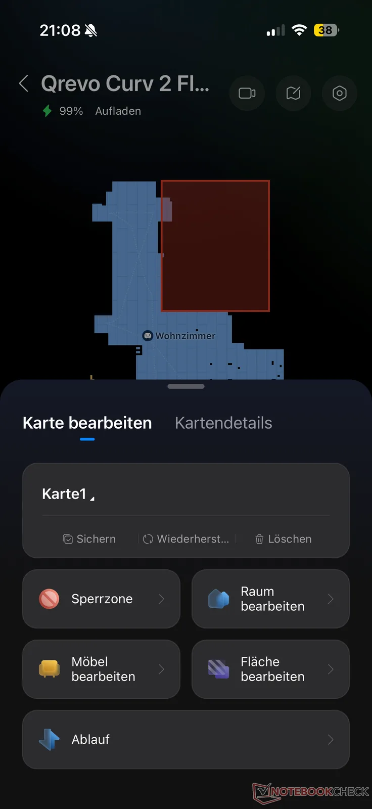 Qrevo Curv 2 Flow skannade omgivningen på ett tillförlitligt sätt och skapade en virtuell karta inom några minuter. Detta var redan ganska bra när det gäller den rumsliga fördelningen. Med lite omarbetning, inklusive valfria uteslutningszoner, slutfördes installationen inom cirka 10 till 15 minuter.