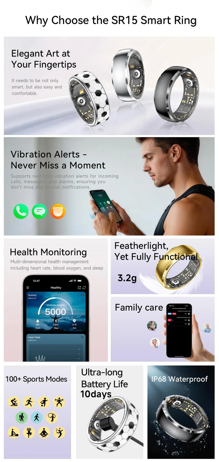 SR15 har flera interaktiva funktioner. En inbyggd vibrationsmotor ger haptiska varningar för inkommande samtal, meddelanden och larm direkt på fingret. Användarna kan också använda gestkontroller, t.ex. dubbeltryckning, för att navigera i musik, e-böcker eller korta videoklipp på en parkopplad smartphone. Kompatibiliteten omfattar Android 9.0 och iOS 10.0 eller senare versioner.