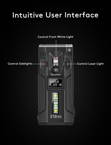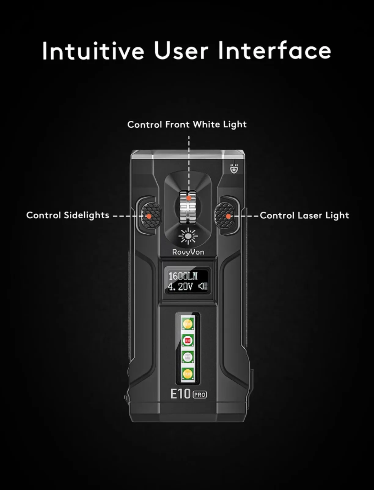En unik funktion är skrollhjulet som gör det möjligt att justera ljusstyrkan; genom att klicka på hjulet växlar man mellan olika lägen. Knappen till vänster om scrollhjulet aktiverar "sidoljuset", som sitter på ovansidan av RovyVon E10 Pro, medan det sitter på sidan av den i övrigt identiska och prismässigt likvärdiga E10 Max. Denna andra lampa kan till exempel användas som en varmvit läslampa eller som en röd SOS-signal.