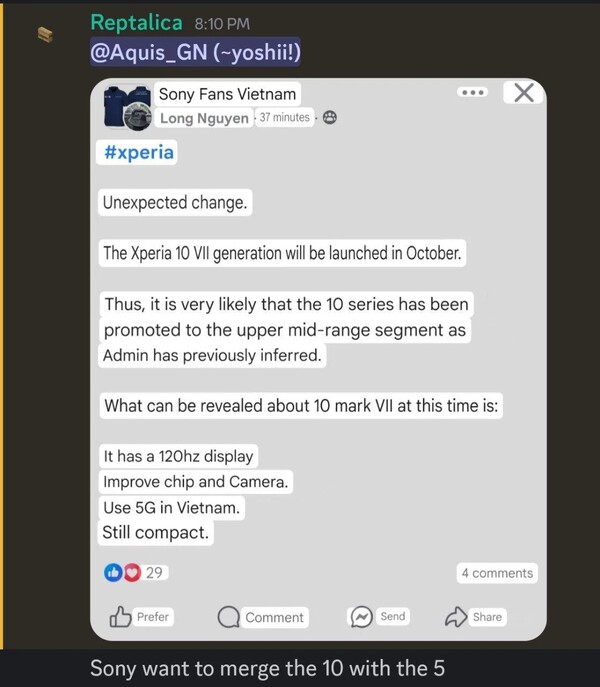 Om Xperia 10 VII kommer att inta den övre mellanklassplatsen i sortimentet kommer prislappen att återspegla den förändringen. Den här typen av telefonklassificering är mycket subjektiv, men det kan vara en praktisk ursäkt för Sony att pumpa prislappen långt över 500 £ (~ 671 $) och slutligen döda alla återstående förhoppningar om en Xperia 5 återupplivning. Intressant nog säger ryktet i Facebook-gruppen att denna oktoberversion har ett "förbättrat chip och kamera" och kommer också med den extra kommentaren att "Sony vill slå samman 10 med 5". Om detta är fallet kan det finnas en helt helt ny Xperia-telefon komma senare i år.
