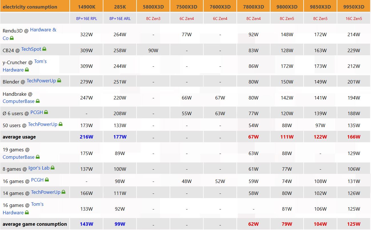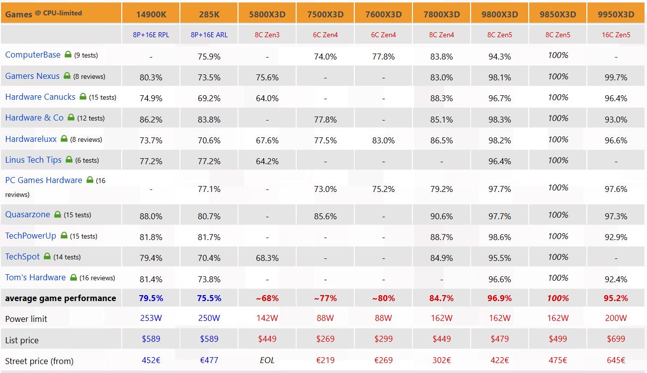 Den nyligen lanserade Ryzen 7 9850X3D för 499 USD är AMD:s snabbaste gamingprocessor. Enligt 3DCenters analys av 14 lanseringsrecensioner är Ryzen 7 9850X3D enligt uppgift cirka 3,2% snabbare i spel än Ryzen 7 9800X3D, 5% snabbare än Ryzen 9 9950X3D och hela 32% snabbare än Core Ultra 9 285K. Ryzen 7 9850X3D:s extra spelprestanda kommer dock på bekostnad av mycket högre strömförbrukning.