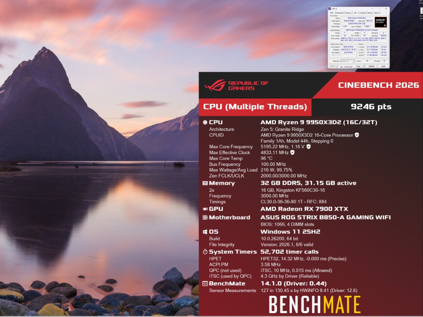 De riktmärken som publicerats på HWBOT är av användaren Stoikov och de inkluderar 7-Zip, Cinebench 2026 (både enkel- och flerkärnig) och Cinebench R23 flerkärniga poäng. Alla fyra benchmarks verkar ha körts med en luftkylare, 32 GB DDR5 RAM, en Radeon RX 7900 XTX, på moderkortet Asus ROG Strix B850-A Gaming WIFI.