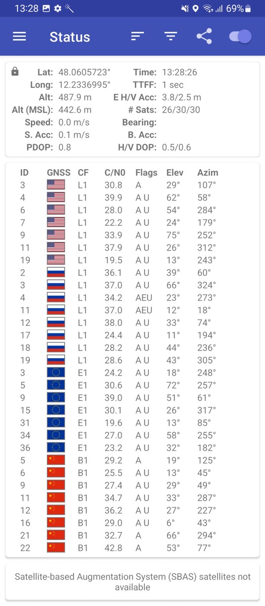 Vår testutrustning har tillgång till GPS-, GLONASS-, Galileo- och Beidou-nätverken för lokalisering. Även om inte så många satelliter upptäcks under testningen är noggrannheten drygt tre meter omedelbart efter att man klivit ut.