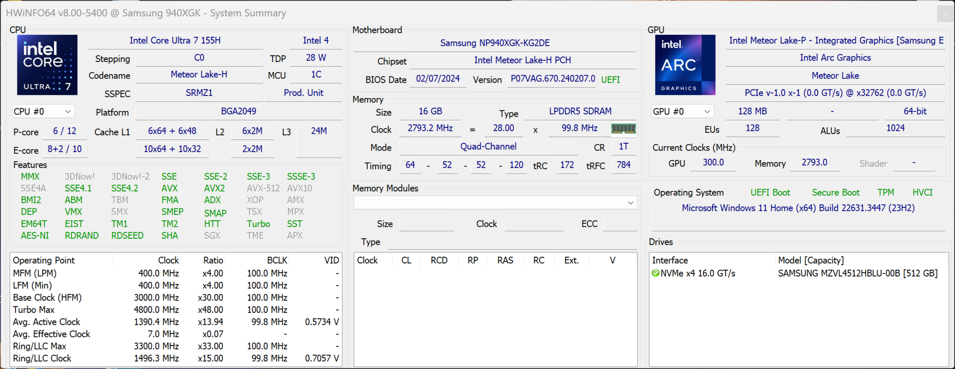 Den nya Meteor Lake-processorn är inte särskilt övertygande, och med tanke på den tillgängliga kylningsprestandan hade en CPU från U-serien kanske varit ett bättre val. Intel kan dock inte riktigt konkurrera inom detta område just nu, vilket är anledningen till att den nya Core Ultra 7 155H ofta får nöja sig med 28 watt (eller lägre). Jämfört med andra Meteor Lake-, AMD Zen4- eller Apple M3-enheter får Galaxy Book4 nästan alltid den kortare änden av pinnen.