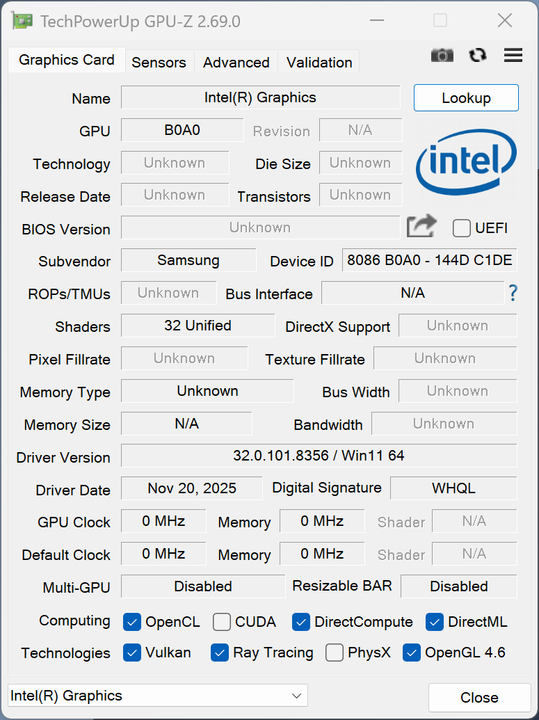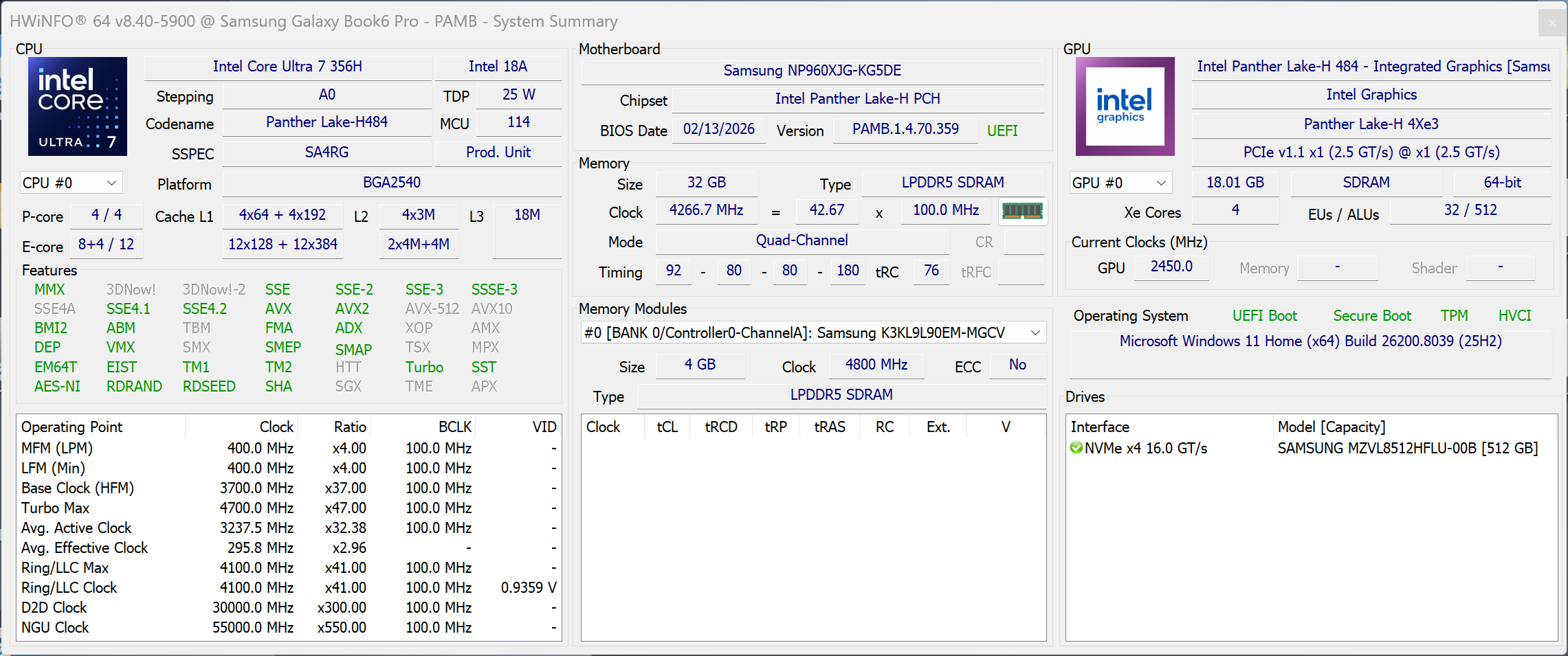 | Samsung Galaxy Book6 Pro Intel Core Ultra 7 356H ⎘ Intel Graphics 4 Xe3 Panther Lake iGPU ⎘ 32 GB Minne, 512 GB SSD | Amazon: Listpris: 2199€ | 1.6 kg | 11.9 mm | 16.00" 2880x1800 212 PPI OLED | |