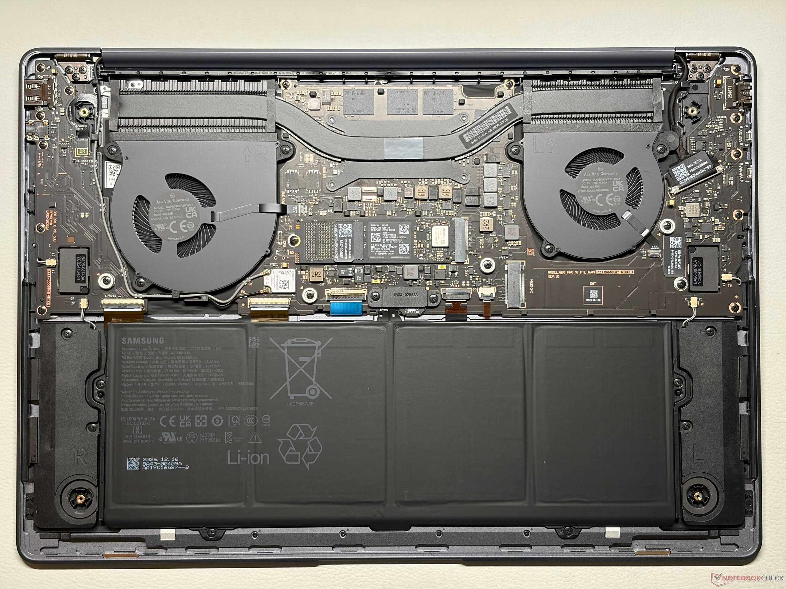 Chassidesignen ser i stort sett identisk ut med den tidigare modellen, vilket innebär att du återigen får en snygg 16-tums bärbar dator med ett högkvalitativt aluminiumchassi. Silverfärgen drar inte riktigt till sig fingeravtryck och stabiliteten är utmärkt. Speciellt den nedre ramen är återigen mycket tjock och den nya tangentbordsdesignen samt den omarrangerade Samsung-logotypen på locket är i princip de enda två synliga förändringarna. Den interna layouten ändrades också något, men du får fortfarande två fullstora M.2-2280 SSD-kortplatser, alla andra komponenter är ombord.