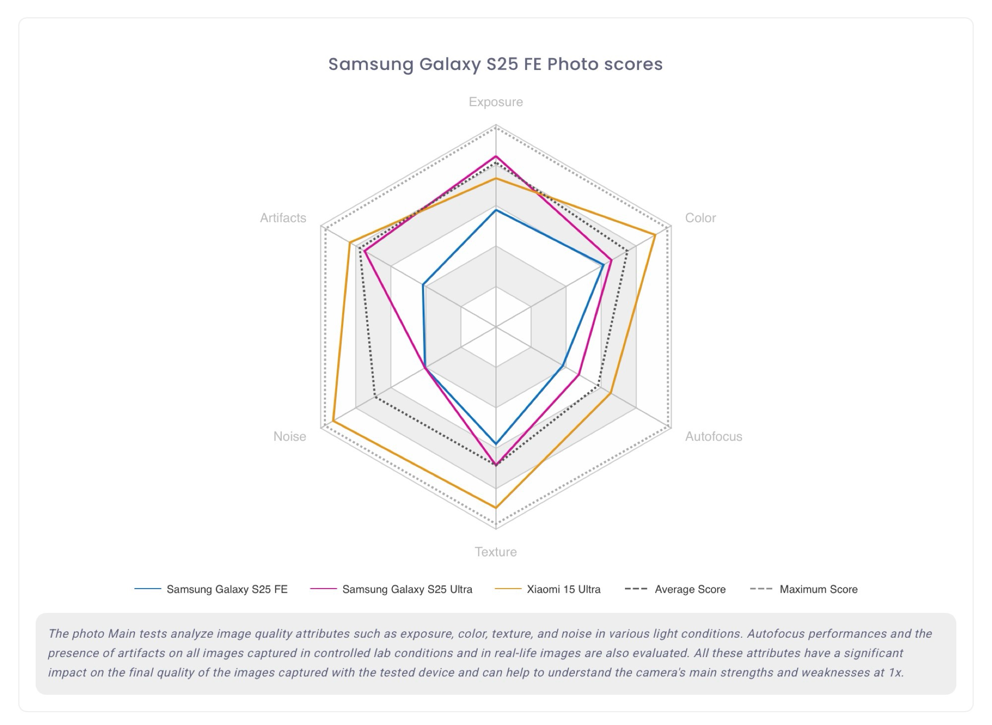 Porträttläget med bokeh-simulering ledde till en märkbar detaljförlust över hela bilden. Obehagliga artefakter uppträdde också ofta när man fångade rörliga motiv. Enligt DxOMark skulle de som söker ett högkvalitativt kamerasystem till ett mellanpris hellre köpa Xiaomi 15, Google Pixel 10 eller Xiaomi 14T än Samsung Galaxy S25 FE