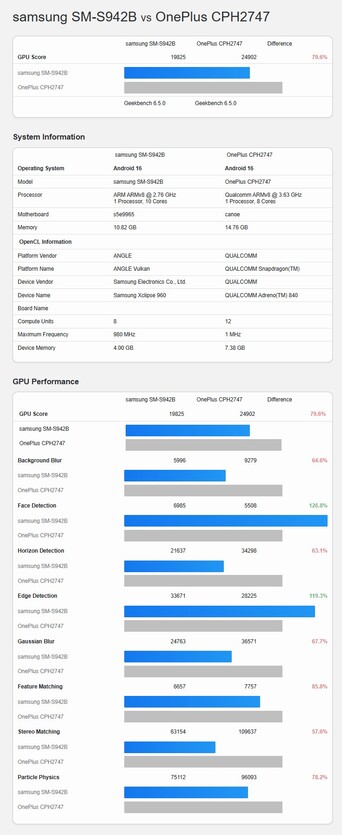 I det här fallet är det inte ett CPU-benchmark utan ett Vulkan- och OpenCL GPU-test. I tidiga testenheter kom den här grafikenheten ganska nära Snapdragon 8 Elite Gen 5, som finns i OnePlus 15(från 999 dollar på Amazon) och andra Android -telefoner. Jämförelsen är inte helt rättvis, eftersom Samsung Galaxy S26 sannolikt kommer att få mer prestanda under de kommande veckorna via mjukvaruoptimeringar. Trots detta erbjuder Xclipse 960 GPU redan 88% av prestandan hos Adreno 840 GPU i Vulkan, eller strax under 80% i OpenCL.