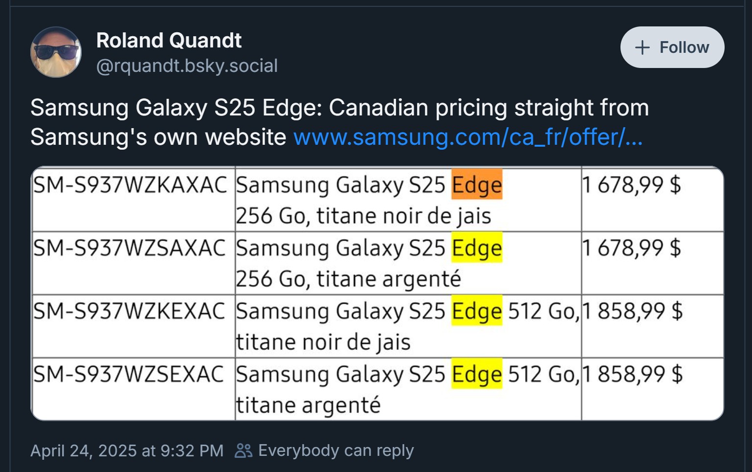 Samsung har ännu inte officiellt tillkännagivit lanseringsdetaljerna för Galaxy S25 Edge, trots att företaget har visat upp den tunna och lätta telefonen flera gånger. Enligt de senaste rapporterna kommer detta tunna flaggskepp att göra en full debut på 13 maj 2025och innan något formellt tillkännagivande kan företaget av misstag ha avslöjat de kanadensiska prisuppgifterna för smarttelefonen.