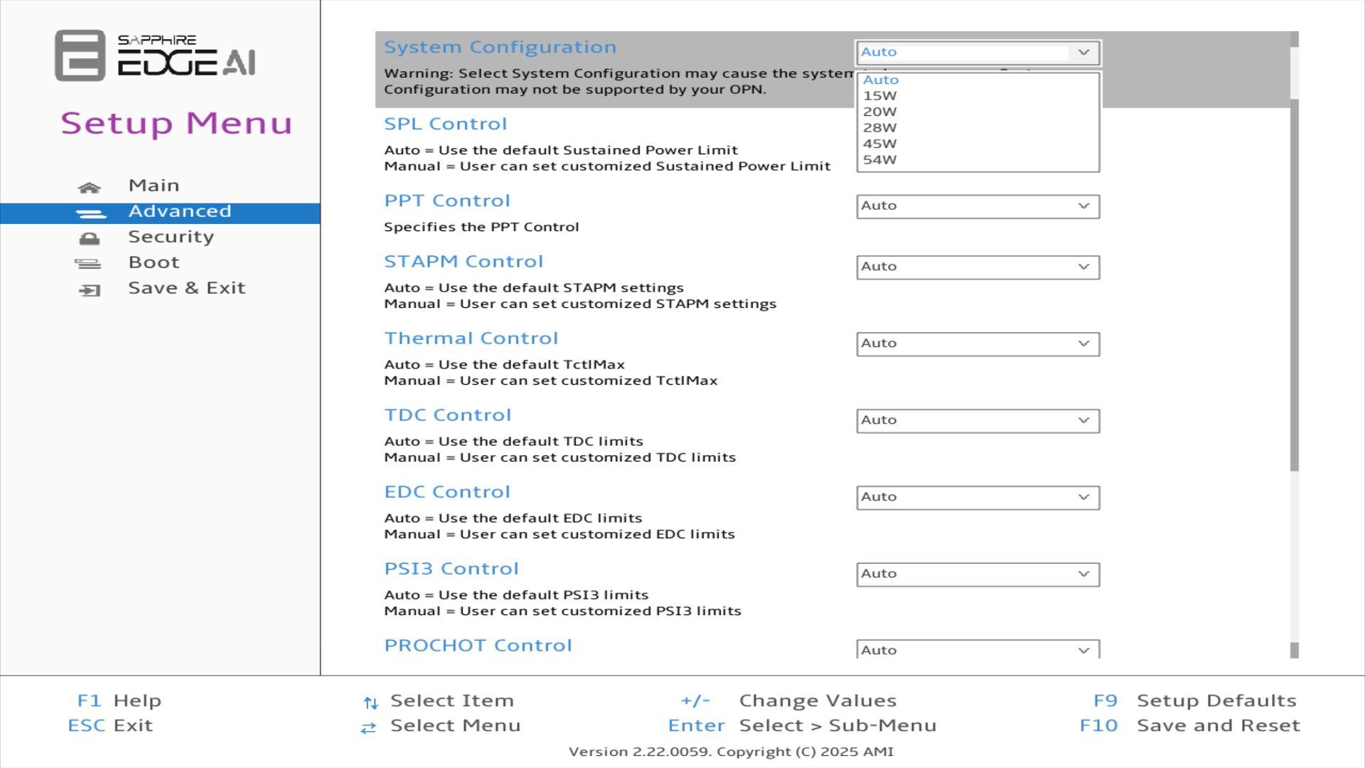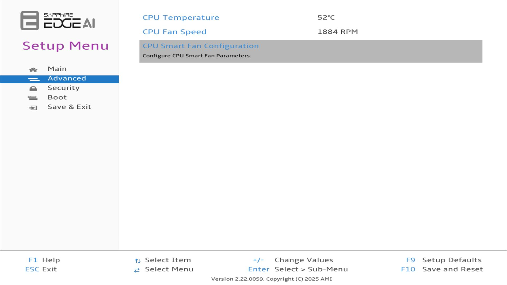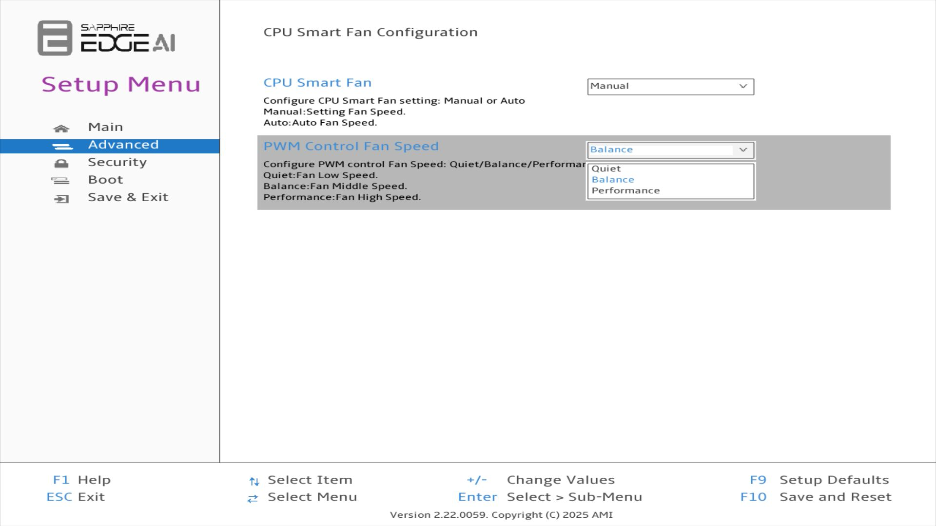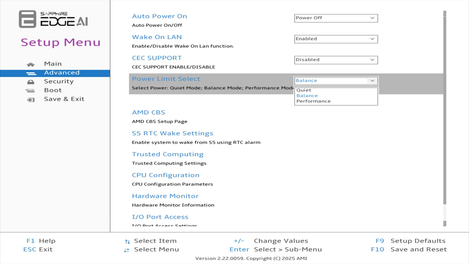 I Sapphire Edge AI kommer AMD Ryzen AI 9 HX 370 används - ett 12-kärnigt Zen 5-arkitekturchip som levererar imponerande prestanda i enkel- och flerkärniga applikationer. I fabriksinställningarna arbetar SoC med en kontinuerlig strömförbrukning på 35 watt och levererar därmed prestanda som ligger i nivå med konkurrenterna. Även om olika prestandaprofiler kan väljas i BIOS, är skillnaderna knappast märkbara i vardagligt bruk, även om de är mätbara.