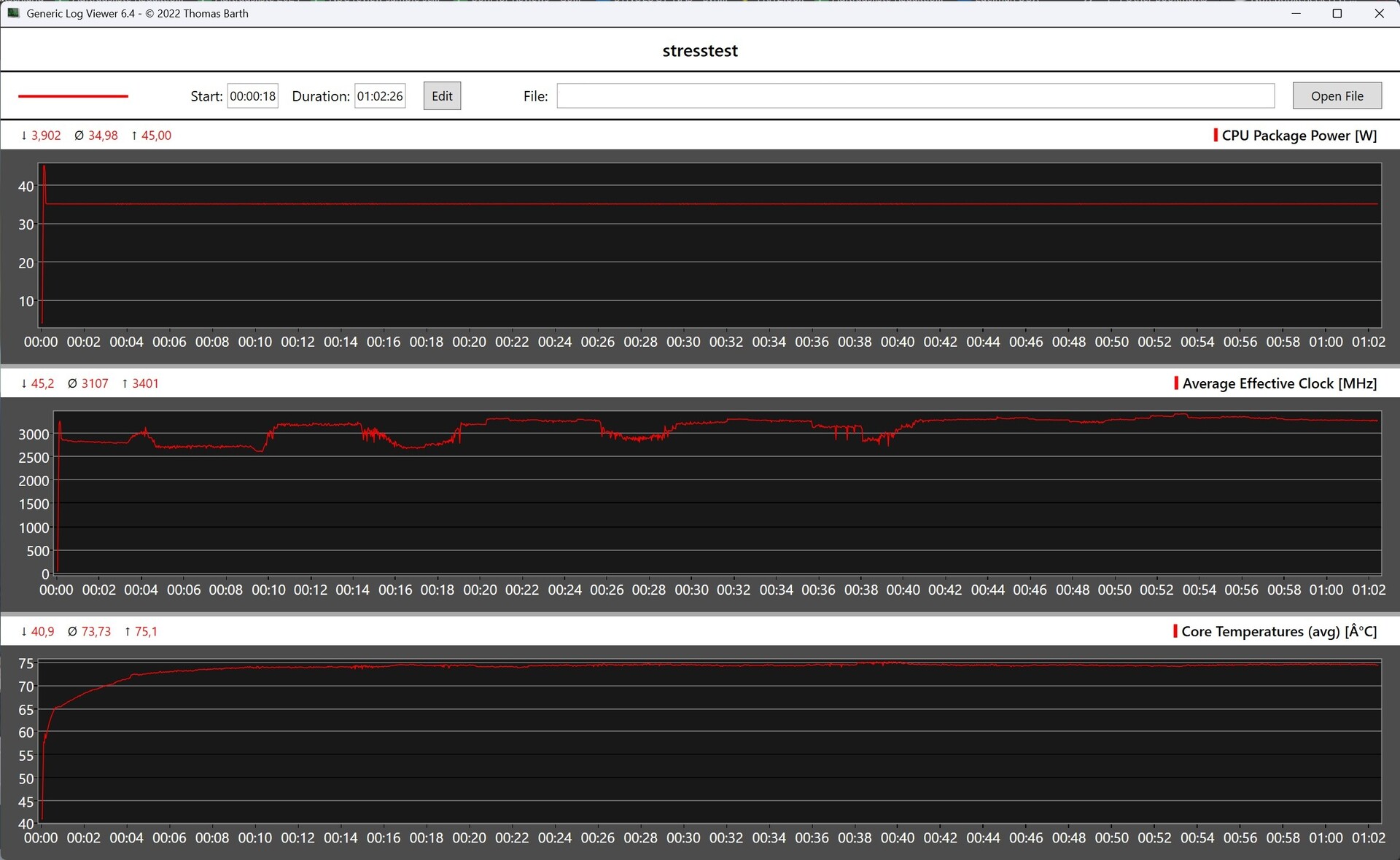 Höljet på Sapphire Edge AI förblir oansenligt både i viloläge och under belastning. Toppen värms upp något mer än andra områden på grund av den passiva SSD-anslutningen. I stresstestet når Ryzen AI 9 HX 370 kortvarigt cirka 75 C, men detta är inte kritiskt. Telemetridata visar att kylsystemet enkelt kan upprätthålla den permanent tillämpade TDP på 35 watt.