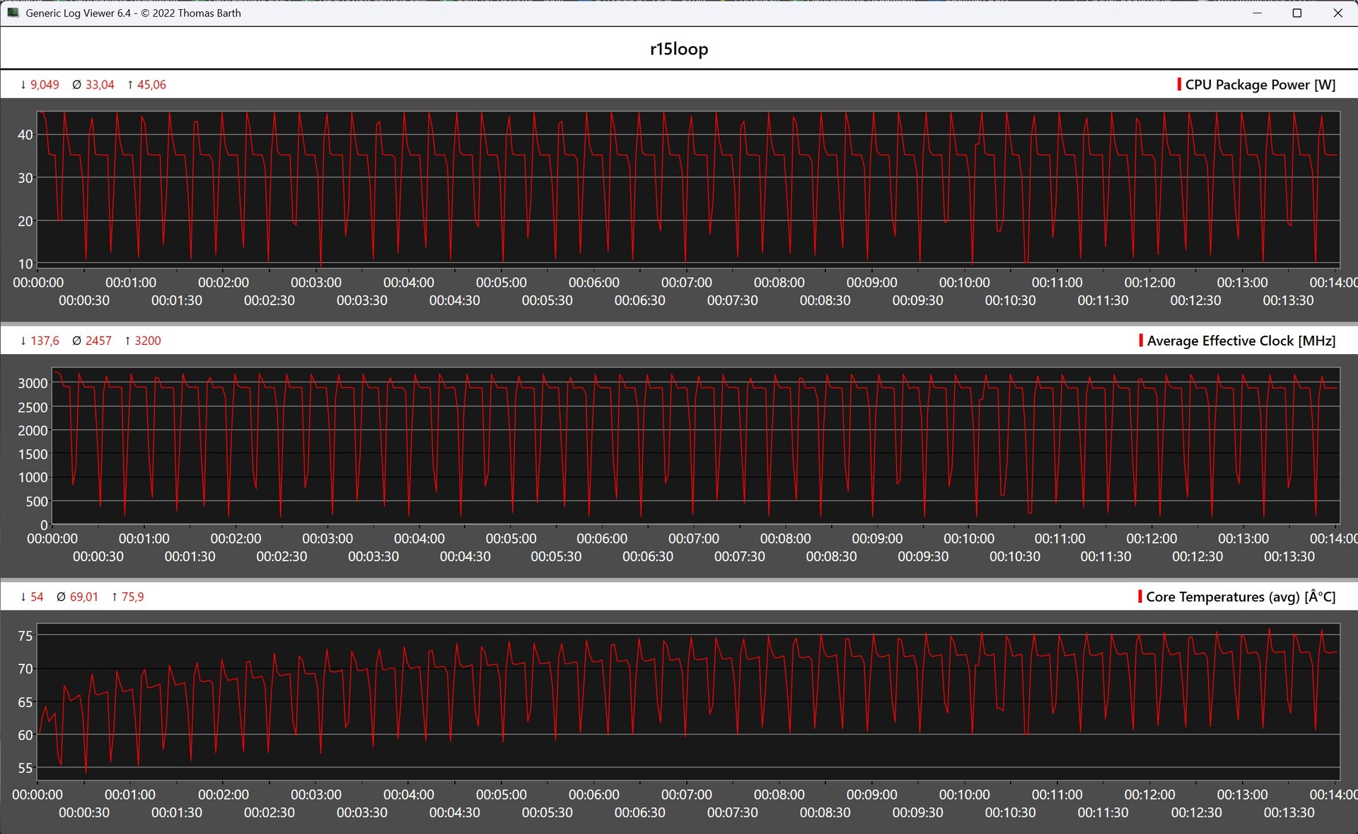 Uthållighetstestet Cinebench R15 visar tydligt att Sapphire Edge AI är ett vältrimmat system. Prestandan hos AMD Ryzen AI 9 HX 370 förblir stabil även under kontinuerlig belastning och är ganska sval trots den kompakta designen och den relativt lilla kylenheten.