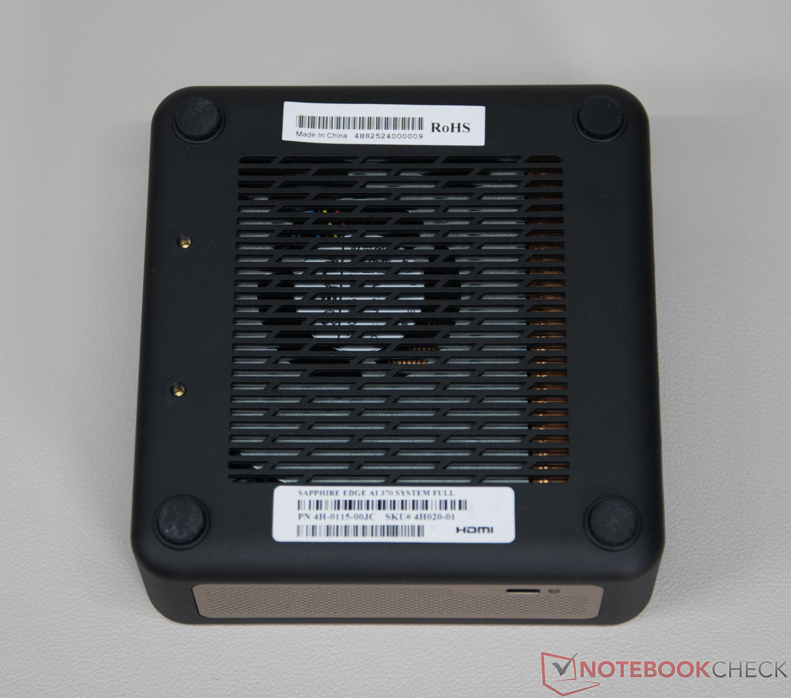Sapphire Edge AI har ett mycket kompakt fodral som ser mycket högkvalitativt ut tack vare sitt svarta och guldfärgade färgschema. Haptiskt kan Sapphire Edge AI dock inte hålla jämna steg med det högkvalitativa metallchassit hos konkurrenter som Geekom. Sapphire förlitar sig på ett rent bearbetat plastchassi, vilket också återspeglas i den låga vikten.