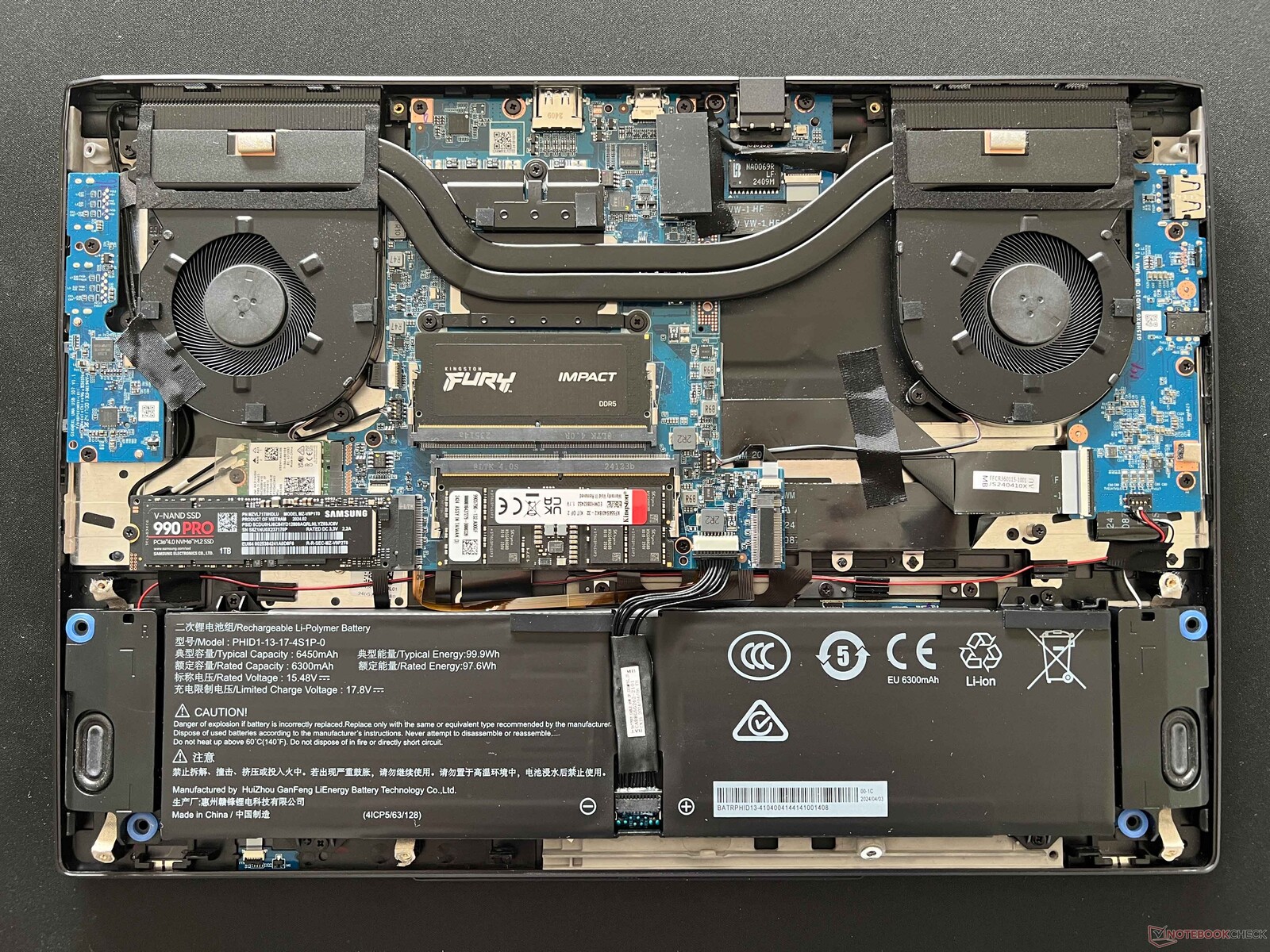 Nu kommer vi till en av höjdpunkterna med Evo 15, nämligen underhållsmöjligheterna. När du har tagit bort bottenkåpan (som är fäst med vanliga Phillips-skruvar) kommer du åt fläktarna och det skruvade batteriet, liksom de två SO-DIMM-platserna för RAM och två M.2 2280 SSD-platser; uppgraderingar är därför barnspel. WLAN-modulen kan också bytas ut vid behov.
