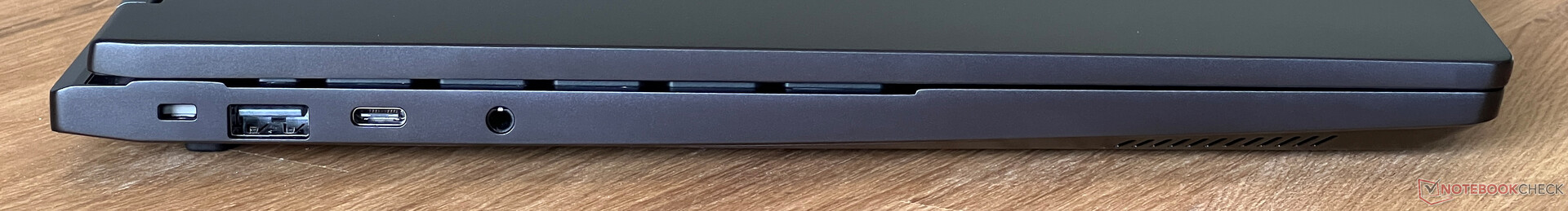 Portarna är fördelade på de två bakre sidorna och på baksidan. I princip är alla moderna standarder inklusive Thunderbolt 4 (eller USB 4.0 på AMD-modellen) tillgängliga och det finns också tillräckligt med USB-portar, men vi vet inte vad en USB 2.0-port gör på en modern bärbar dator. Åtminstone finns det bara en av dem, de andra två uppfyller USB 3.2 Gen1-standarden.