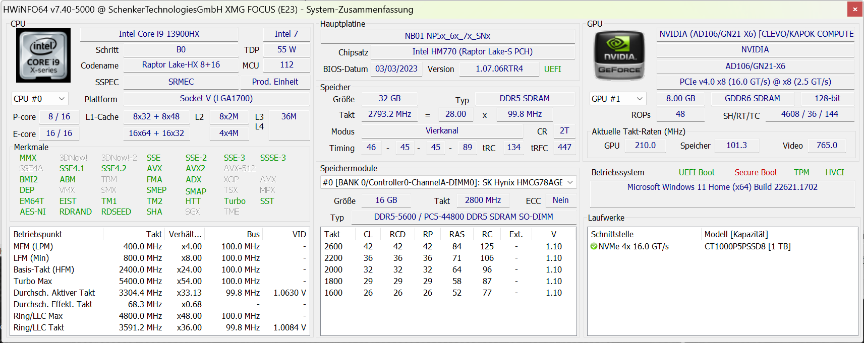 | Schenker XMG Focus 17 (E23) Intel Core i9-13900HX, NVIDIA GeForce RTX 4070 Laptop GPU | Lenovo Legion Pro 5 16ARX8 AMD Ryzen 7 7745HX, NVIDIA GeForce RTX 4070 Laptop GPU | Medion Erazer Major X20 Intel Core i9-13900HX, NVIDIA GeForce RTX 4070 Laptop GPU | Schenker XMG Neo 17 M22 AMD Ryzen 9 6900HX, NVIDIA GeForce RTX 3080 Ti Laptop GPU | HP Omen 17-ck2097ng Intel Core i9-13900HX, NVIDIA GeForce RTX 4080 Laptop GPU | Medion Erazer Defender P40 Intel Core i7-13700HX, NVIDIA GeForce RTX 4060 Laptop GPU | |