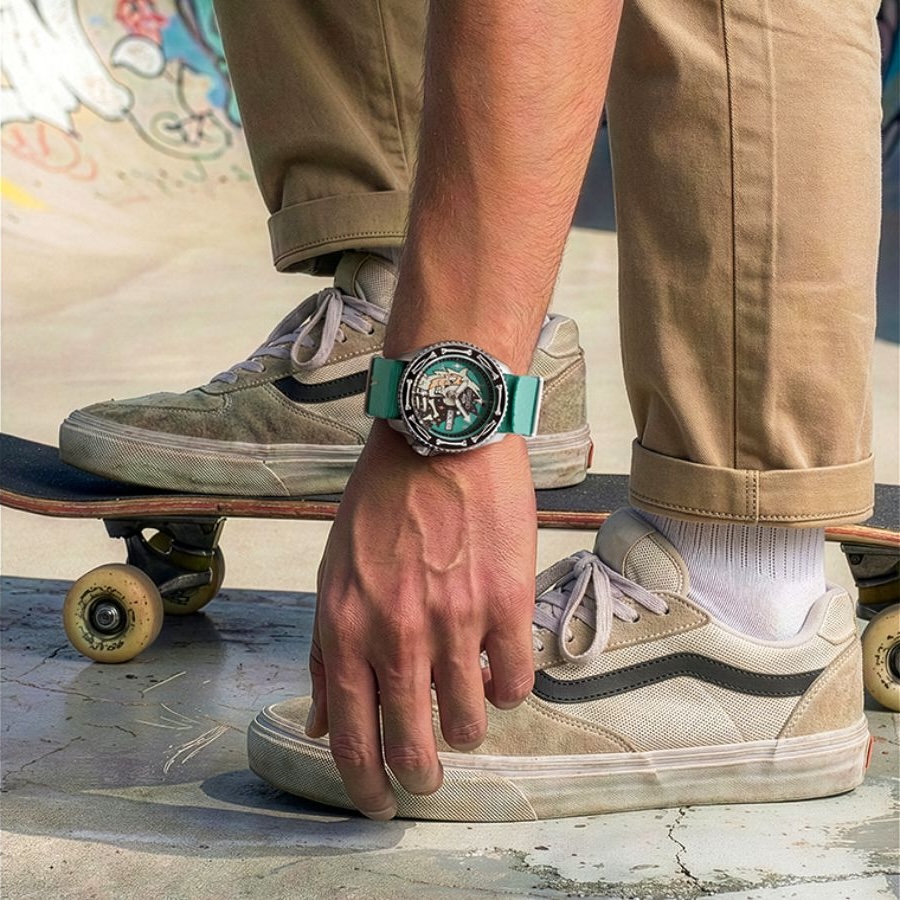 Seikos 5 Sports x Poorboy-klocka har en djärv turkos urtavla med konstnärens apfigur, inspirerad av Yeti och Bigfoot. Det finns ett slående svartvitt benmönster på klockans boettring, med ett silverfärgat hölje i rostfritt stål som mäter 42,5 x 13,4 x 46 mm (~ 1,67 x 0,53 x 1,81 tum). Klockan levereras med utbytbara armband: ett silverfärgat metallarmband som matchar boetten och ett natoband (nylon) i samma nyans som urtavlans bakgrund.