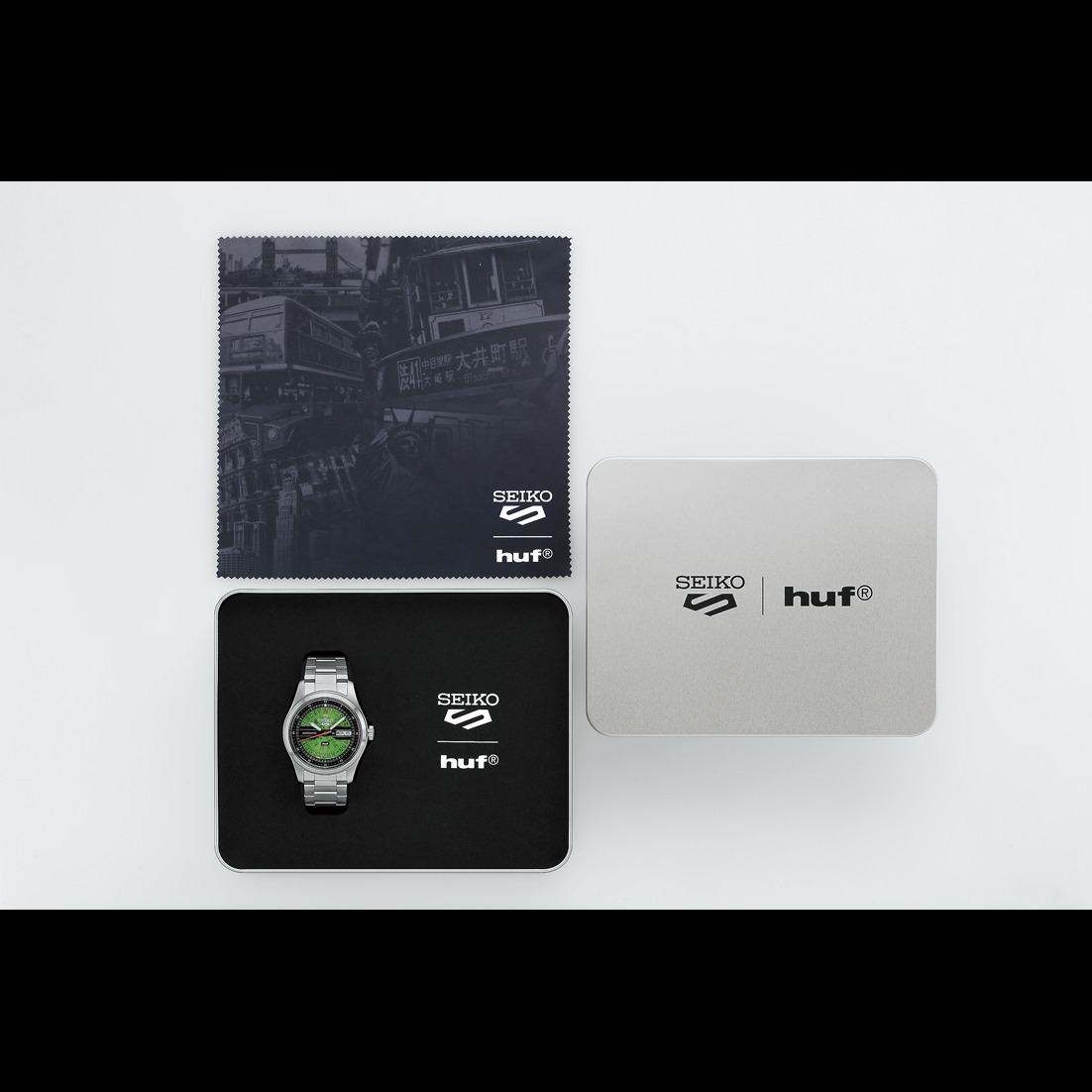 SRPM09 drivs av den automatiska Caliber 4R36som har en gångreserv på ca 41 timmar och som kan lindas och hackas manuellt. Baksidan av boetten är tonad i samma signaturgröna färg som urtavlan och har en grafik inspirerad av San Francisco, där HUF-varumärket grundades. Klockan är kopplad till ett rostfritt stålarmband med en 20 mm fästebredd och levereras i en specialiserad HUF-märkt burk med en rengöringsduk.