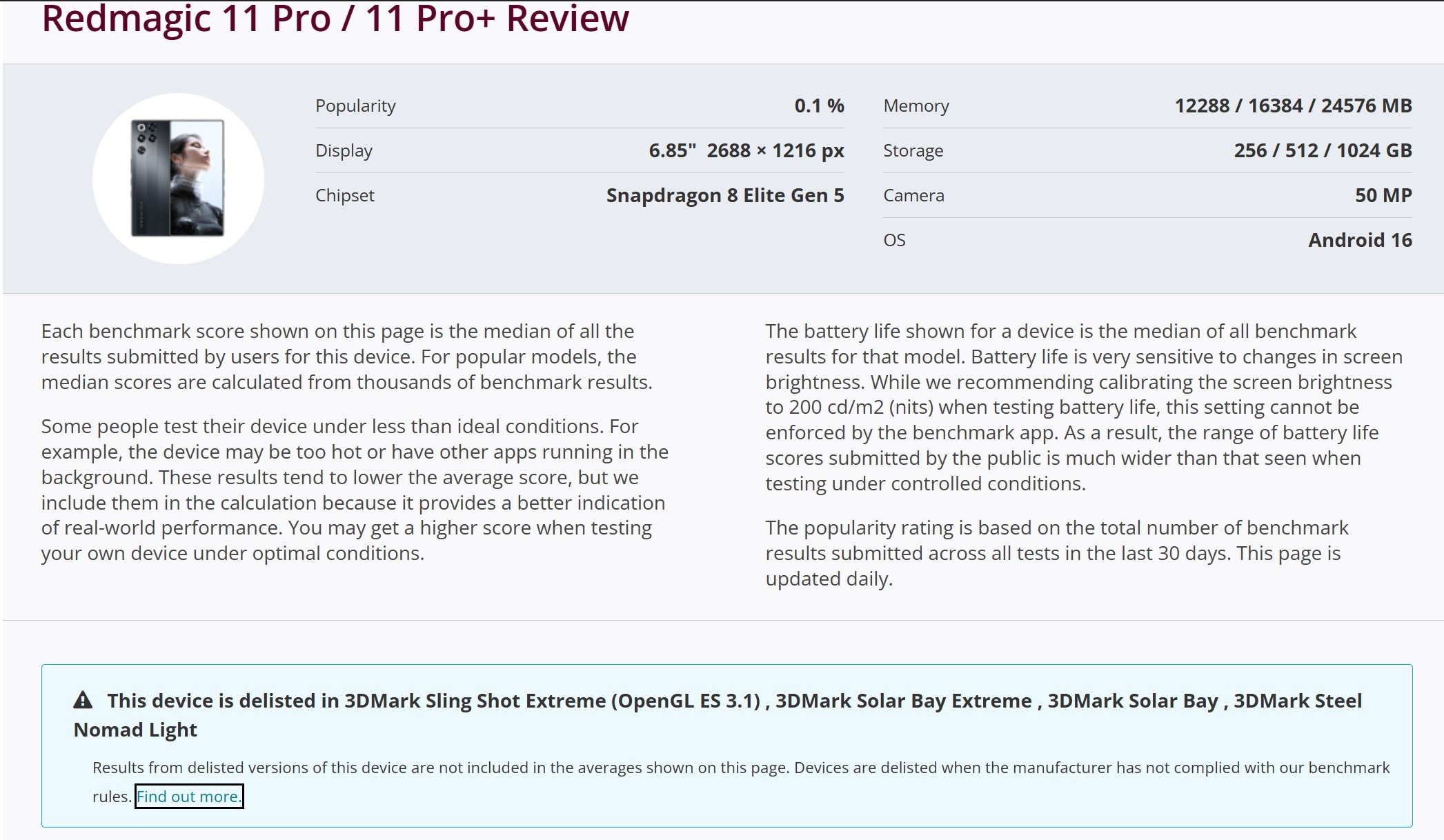 3DMark inkluderar inte längre benchmarkresultat från RedMagic 11 Pro-serien i sina prestandarankningar. Denna avlistning trädde i kraft efter att benchmarkingföretaget fann att speltelefonserien inte följde sina regler och "fuskade" för att uppnå höga poäng.