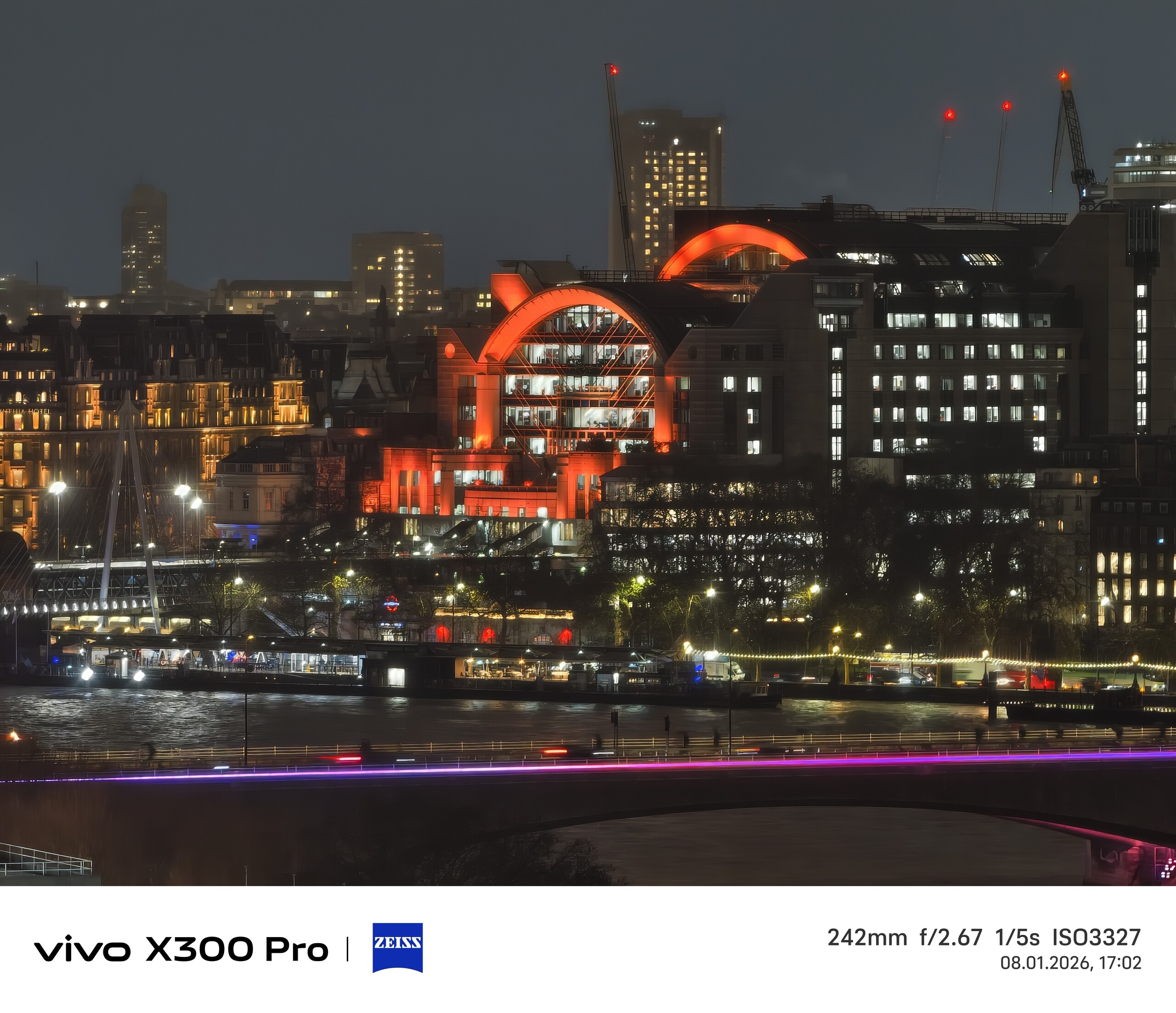 På natten drar Vivo X300 Pro nytta av sin mer ljuskänsliga hårdvara och levererar bättre bildkvalitet, vilket är särskilt tydligt i de fina detaljerna som träden på stranden (1:a bilden) eller broräcket (2:a bilden).