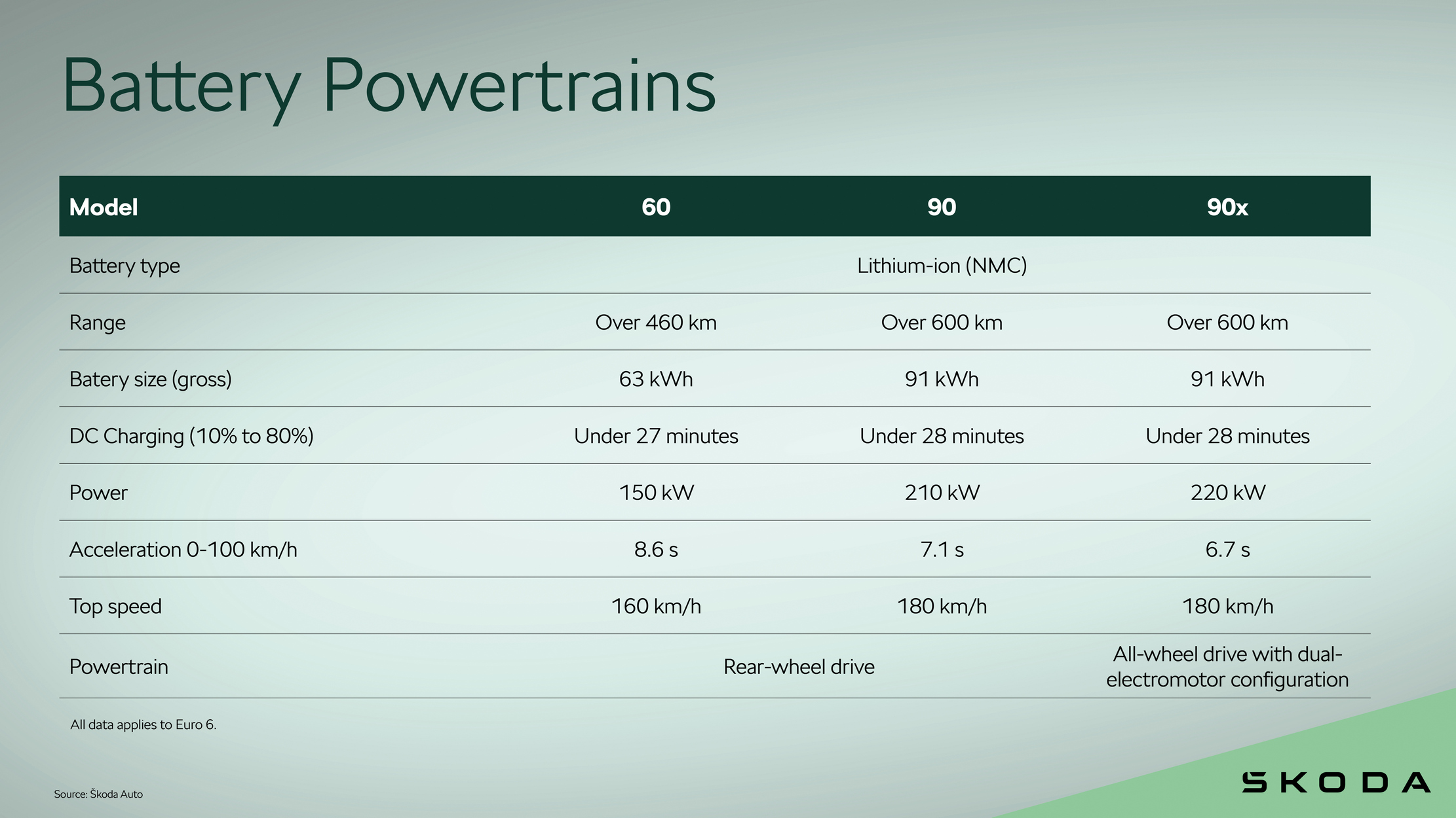 De stora modellerna 90 och 90x överträffar detta med sitt kraftfulla batteri på 91 kWh, vilket möjliggör en räckvidd på över 600 kilometer. 90-modellen har 210 kW effekt och bakhjulsdrift, medan toppmodellen 90x har 220 kW effekt och fyrhjulsdrift med två elmotorer. Alla batterivarianter kan laddas från 10 till 80 procent på under 28 minuter vid en snabbladdare.