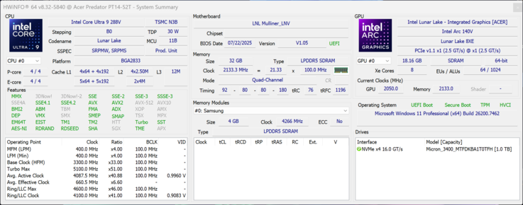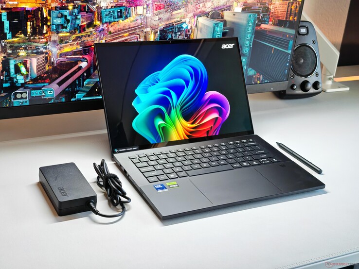 Batteriet på 76 Wh möjliggör rimliga drifttider, men Lunar Lake-processorn ger inte riktigt någon fördel här. Med 9 timmar i WLAN-testet vid 150 cd/m² och 6:45 timmar vid full ljusstyrka ligger Acer strax före Razer Blade 14 (72 Wh), men också klart bakom ROG Zephyrus G14 (73 Wh).