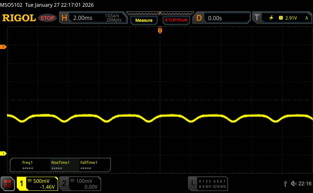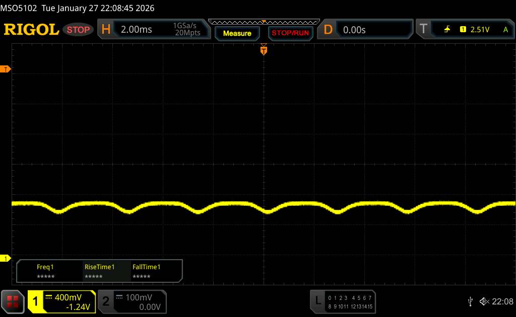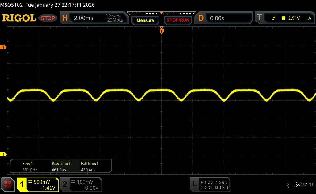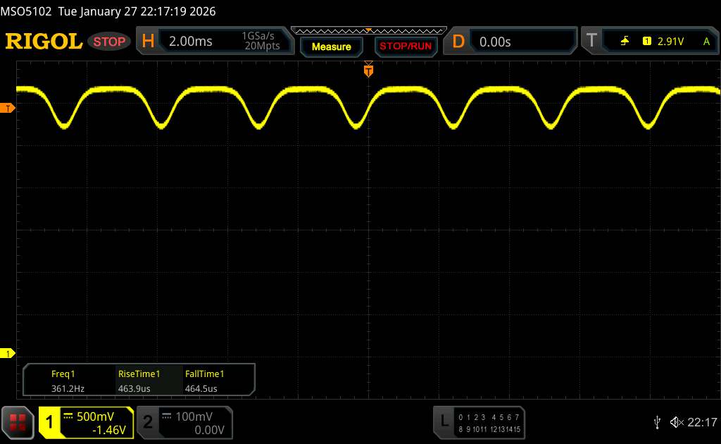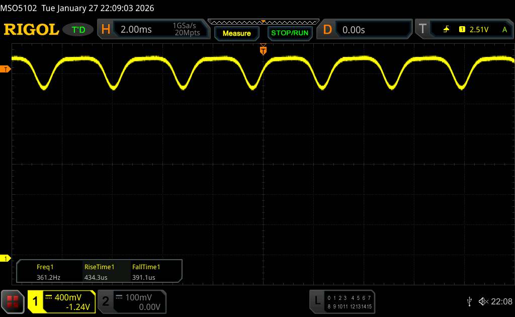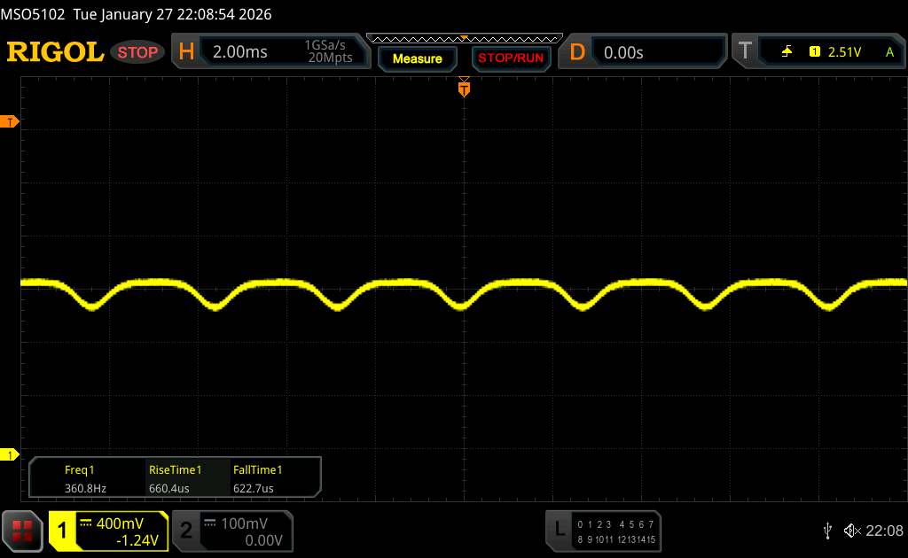 Med hjälp av oscilloskopet uppmätte vi en basfrekvens på 360 Hz. Dock används även högfrekvent PWM-dimning på mer än 1 500 Hz, så eventuella hälsoeffekter för känsliga användare bör förbli begränsade.