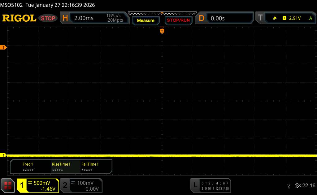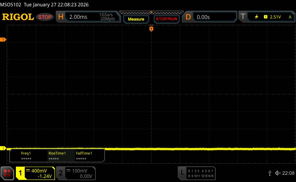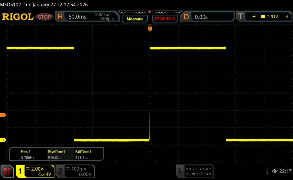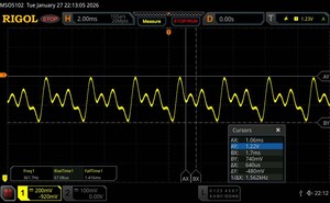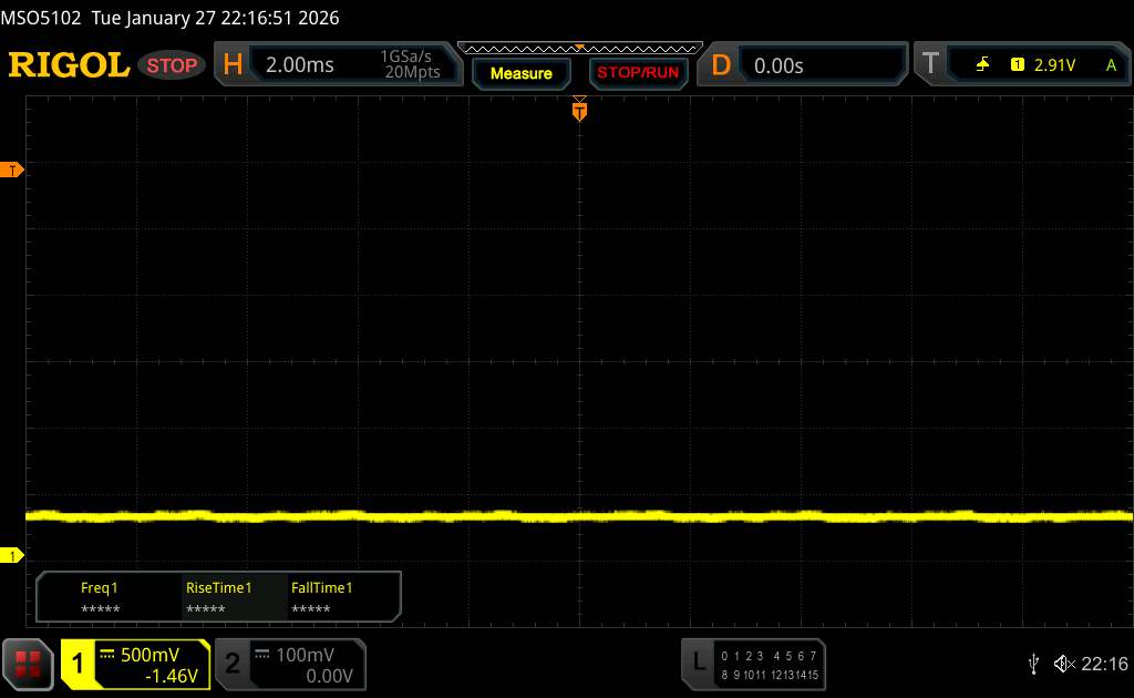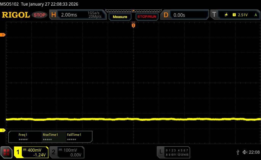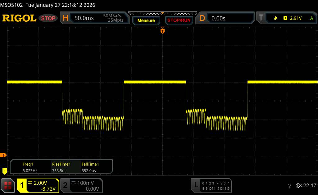 Med hjälp av oscilloskopet uppmätte vi en basfrekvens på 360 Hz. Dock används även högfrekvent PWM-dimning på mer än 1 500 Hz, så eventuella hälsoeffekter för känsliga användare bör förbli begränsade.