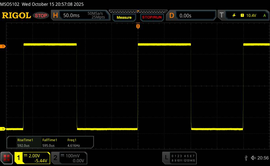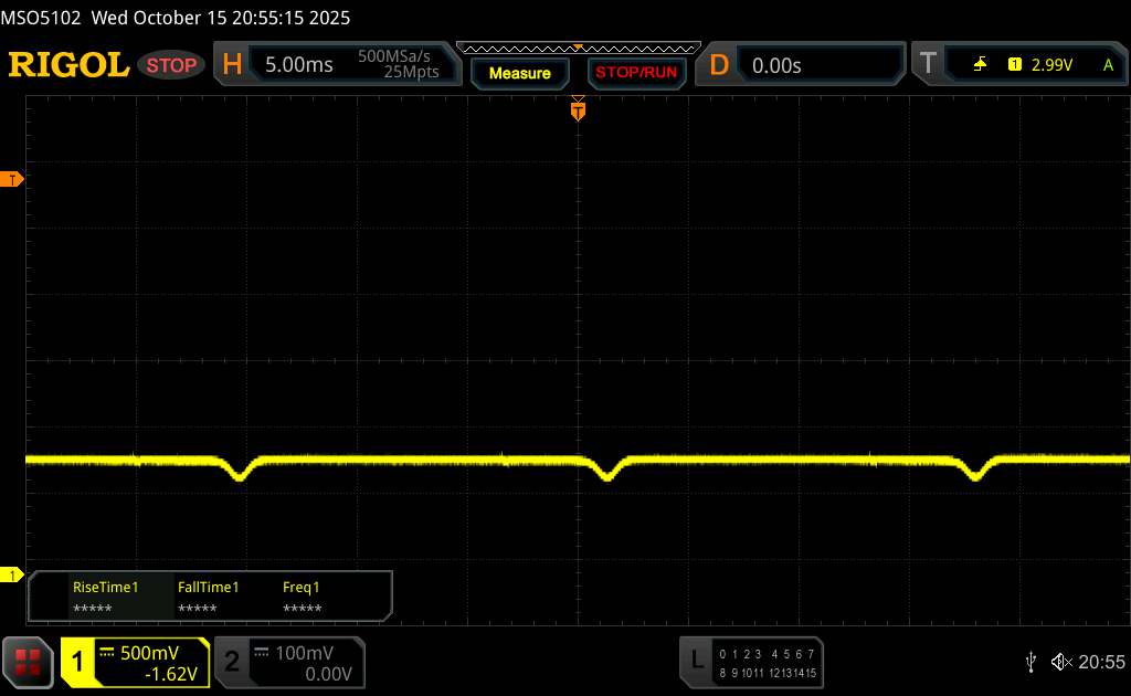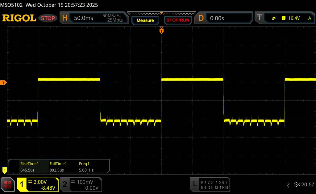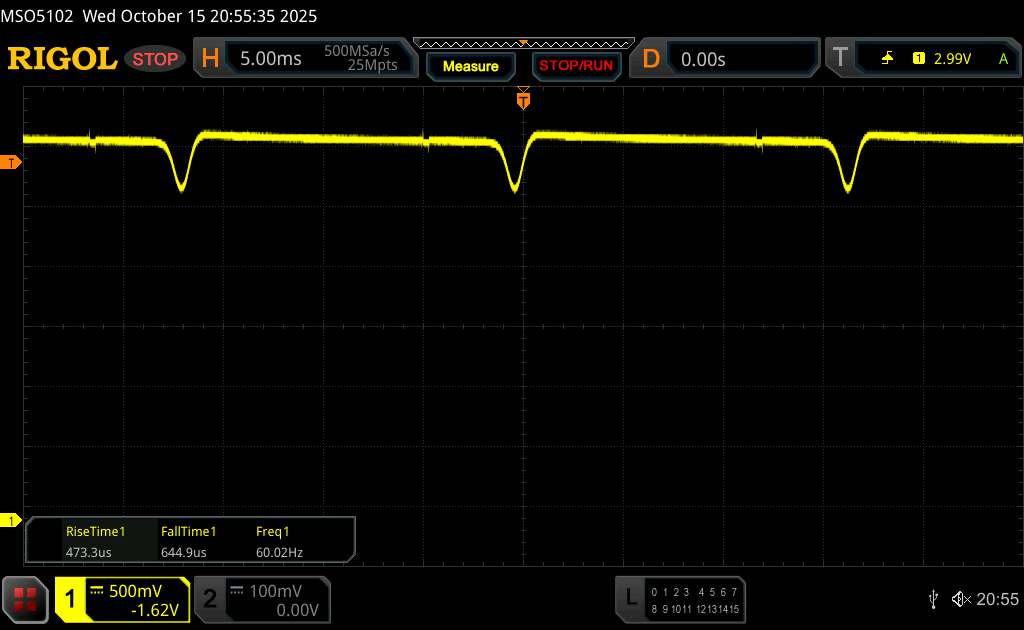 Som förväntat från en OLED-panel visas lågfrekvent flimmer vid bara 60 Hz under oscilloskopet. Tecno mildrar detta med en grund amplitudkurva och högfrekvent PWM-dimning. Vid lägsta ljusstyrka uppmätte vi 2 000 Hz. Även om känslighetsproblem inte kan uteslutas helt, är de osannolika.