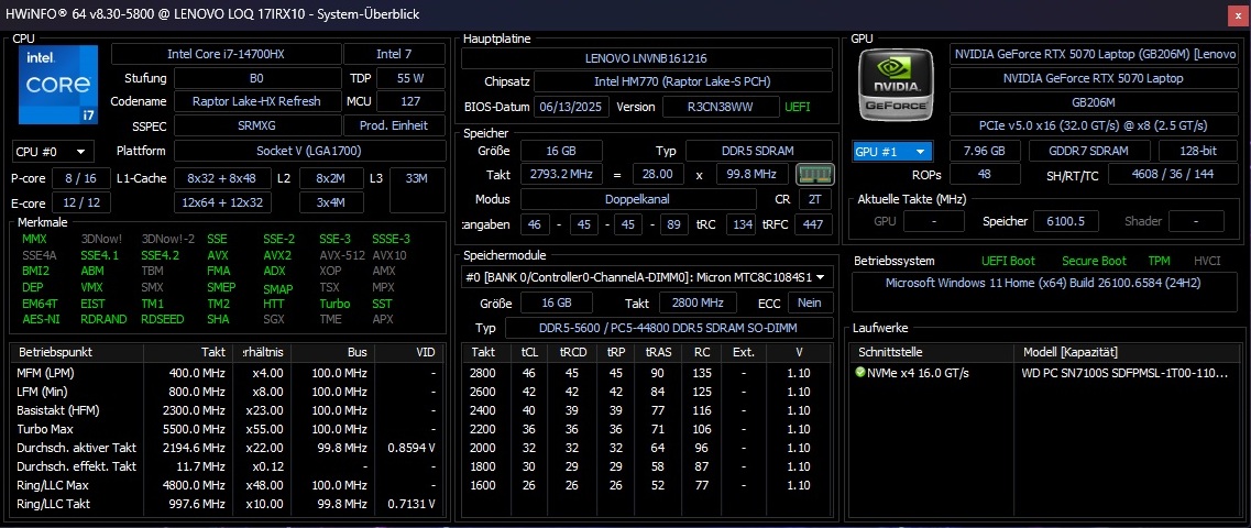 Lenovo LOQ 17IRX10 i7-14700HX, GeForce RTX 5070 Laptop | HP Omen 16-ap0091ng R9 8940HX, GeForce RTX 5060 Laptop | Gigabyte Gaming A16 GA6H i7-13620H, GeForce RTX 5070 Laptop | MSI Crosshair A17 HX D8WGKG R9 8940HX, GeForce RTX 5070 Laptop | SCHENKER XMG Focus 17 M25 i9-13900HX, GeForce RTX 5070 Ti Laptop | |