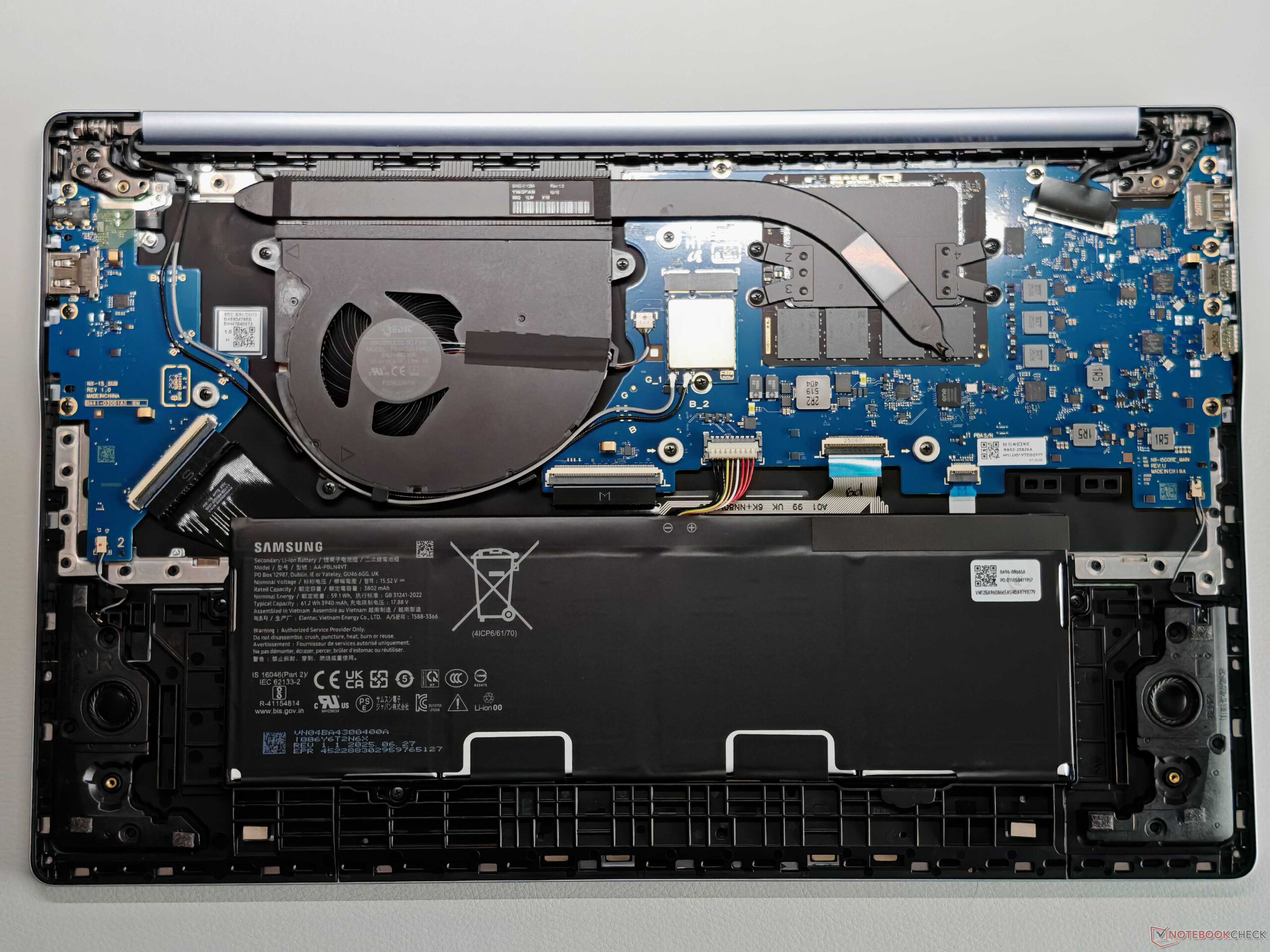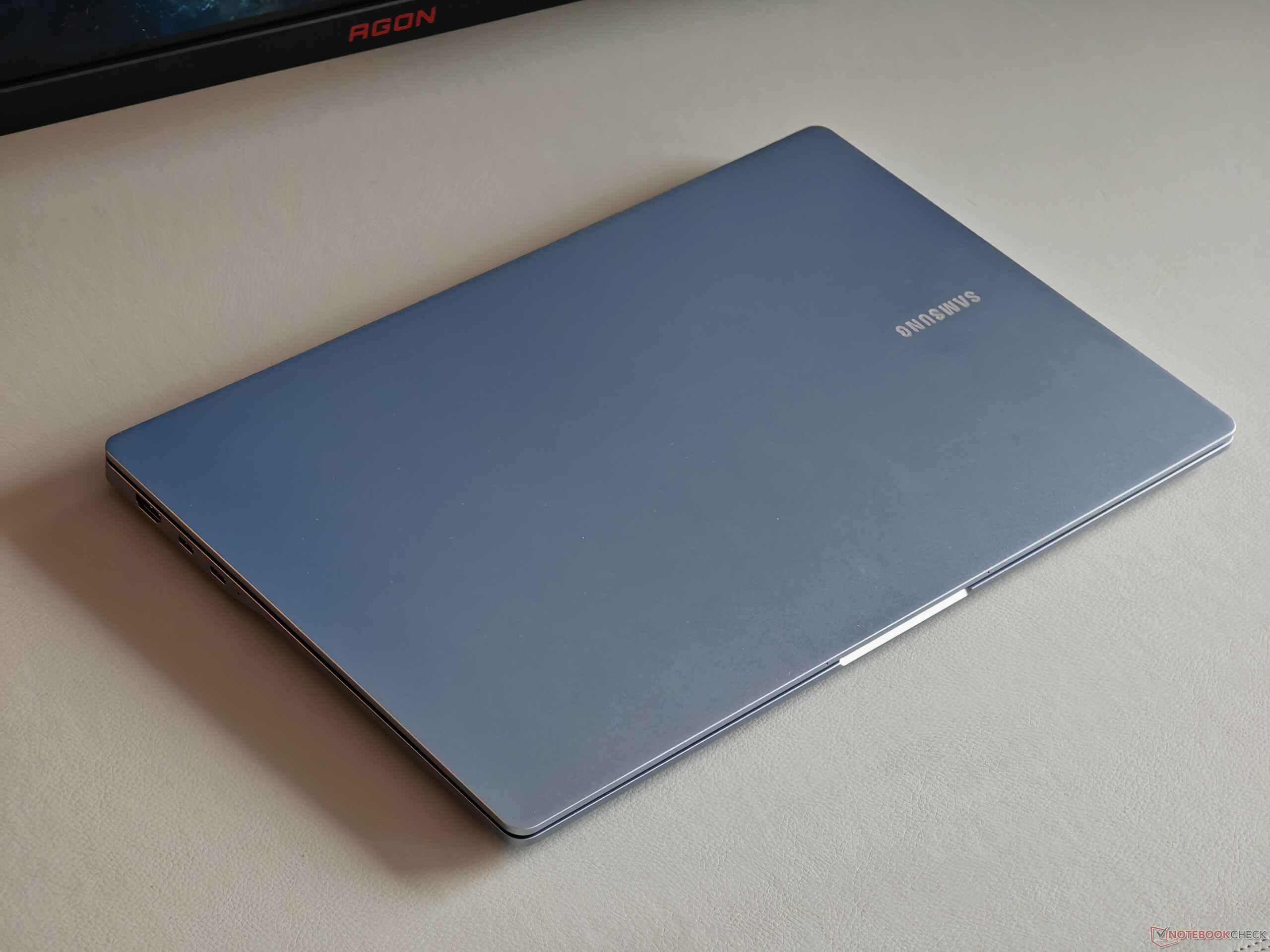 Samsung använder ett tunt metallhölje för Galaxy Book4 Edge, som är 1,5 cm tjock och väger 1,49 kg, vilket gör den lätt att få plats med i vilken ryggsäck som helst. Fodralets färg är Sapphire Blue, vilket är en mycket ljus nyans av blått (snarare silver med en lätt blå nyans). Visuellt ser den bärbara datorn bra ut och kvaliteten är också bra. Endast displayens gångjärn (max. öppningsvinkel 180 grader) är lite för slät och vobblar därför lite. Det nedre höljet kan tas bort (skruvar under gummifötterna), men underhållsalternativen är begränsade till rengöring av fläkten, WLAN-modulen och batteriet, som kan bytas ut vid behov.
