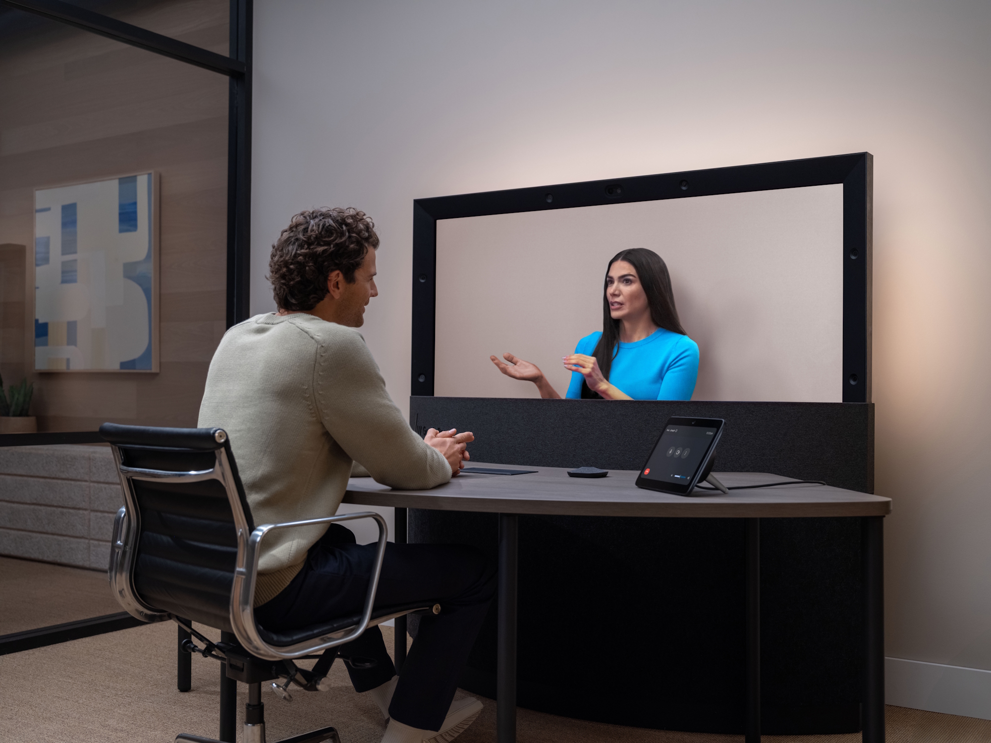 Vad det handlar om är i huvudsak en enorm 3D-skärm som har en rad kameror runt sig, samt två mikrofoner på ett anslutet bord. Användare kan sitta framför bordet och ha videosamtal - videosamtal som faktiskt ser ut som om personen du pratar med sitter precis framför dig.