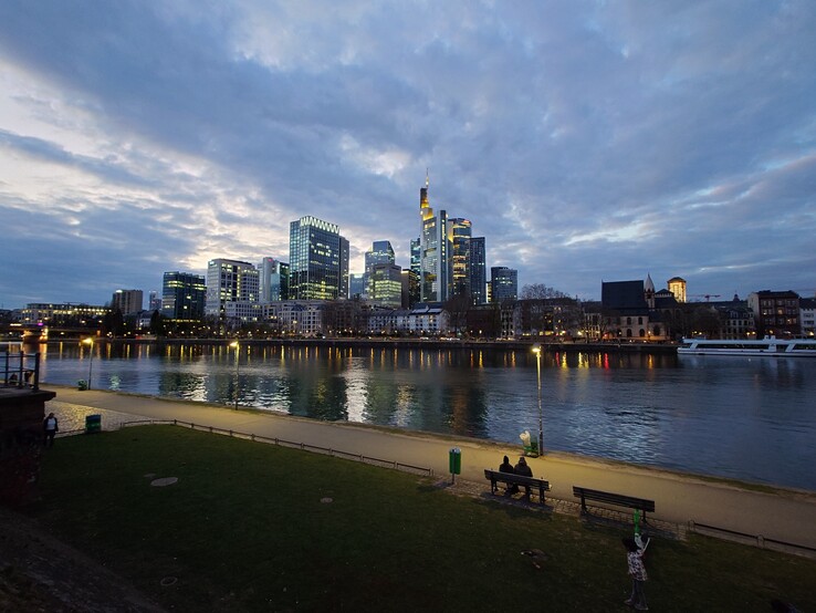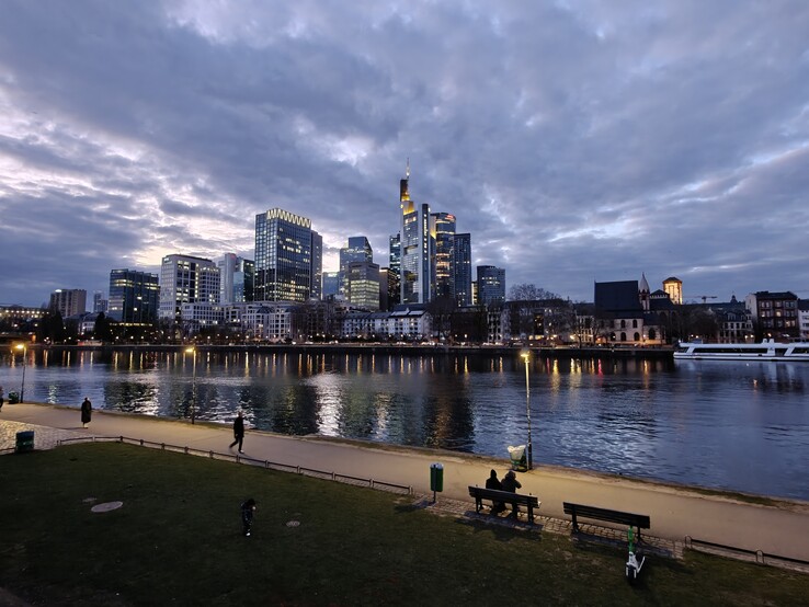 Vi fortsätter vår promenad över Iron Footbridge till andra sidan Main och tittar tillbaka på skyskraporna när solen går ner. Den nya Xperia 1 VI fångar kvällsstämningen på Main-flodens stränder väl med sina något starkare kontraster mellan ljus och mörker.