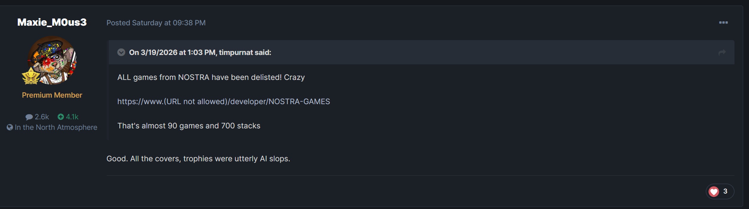 Om man tar hänsyn till regionala variationer försvann 700 spel från Nostra Games. Som webbplatsen Delisted Games webbplatsrapporter, svarade företaget på nyheterna på Discord. Det bekräftade att det inte hade någon avancerad varning men planerar att fortsätta släppa titlar på Nintendo eShopxbox och Steam.