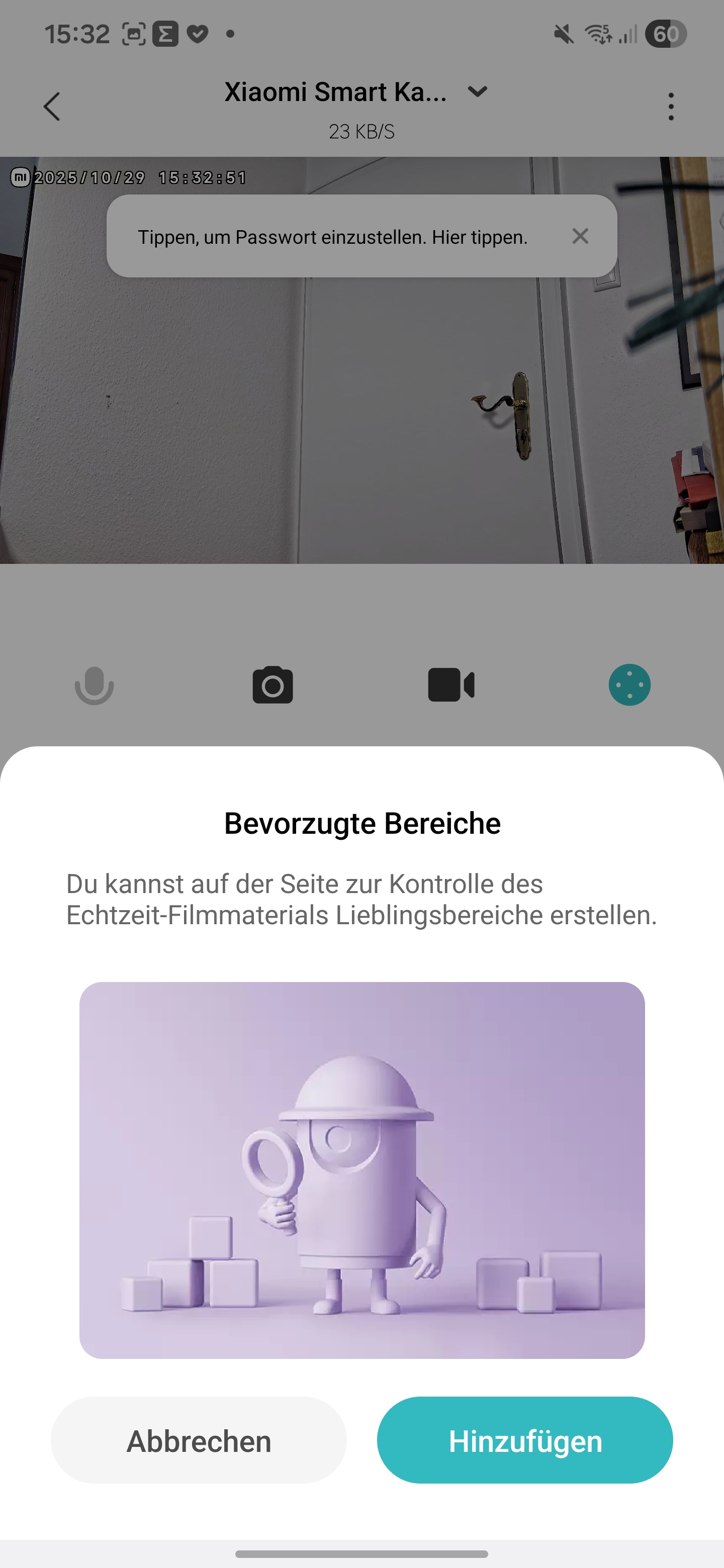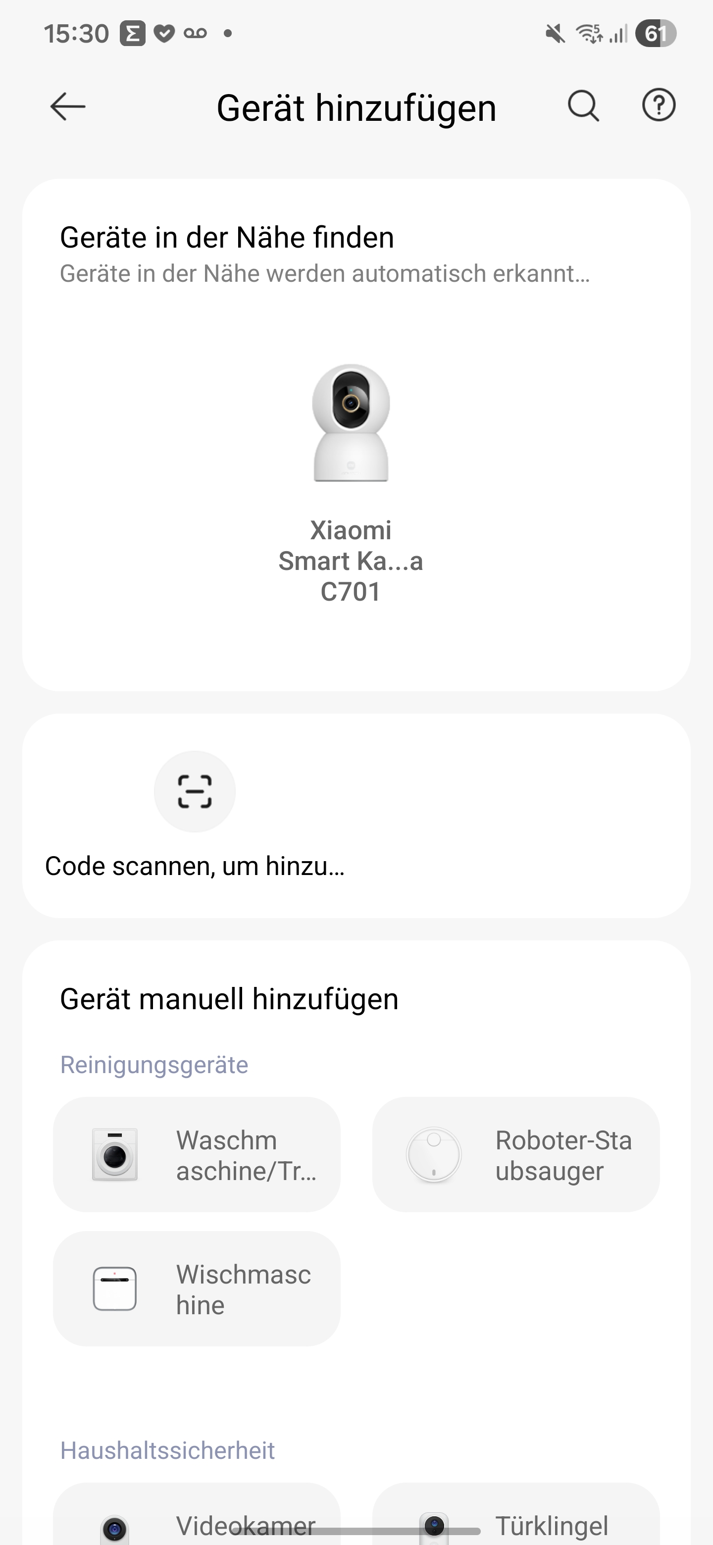 Mi Home-appen krävs för installation. När vi sökte efter en ny enhet dök kameran upp omedelbart i vårt test och kunde paras ihop utan problem. För att slutföra processen måste QR-koden på kamerans undersida skannas.