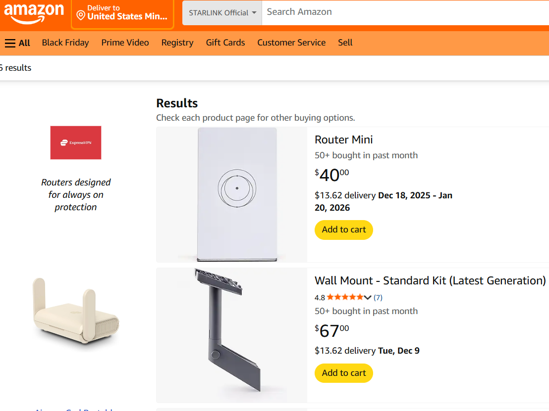 Kunder kan nu köpa specifika Starlink-tillbehör, till exempel Wi-Fi-routern, direkt från webbplatsen, med de flesta artiklar tillgängliga för Prime-leveranser över natten eller en dag. En granskningssida som heter DISHYTech upptäckte ursprungligen den officiella Starlink-butiken tidigare denna månad och noterade att den verkar fungera genom Virtual Supply. Denna Oregon-baserade tredjepartsdistributör säljer en mängd olika konsumentelektronik till stora boxhandlare och sålde tidigare den vanliga Starlink-skålen, vilket tyder på att mer inventering kan erbjudas över tiden.