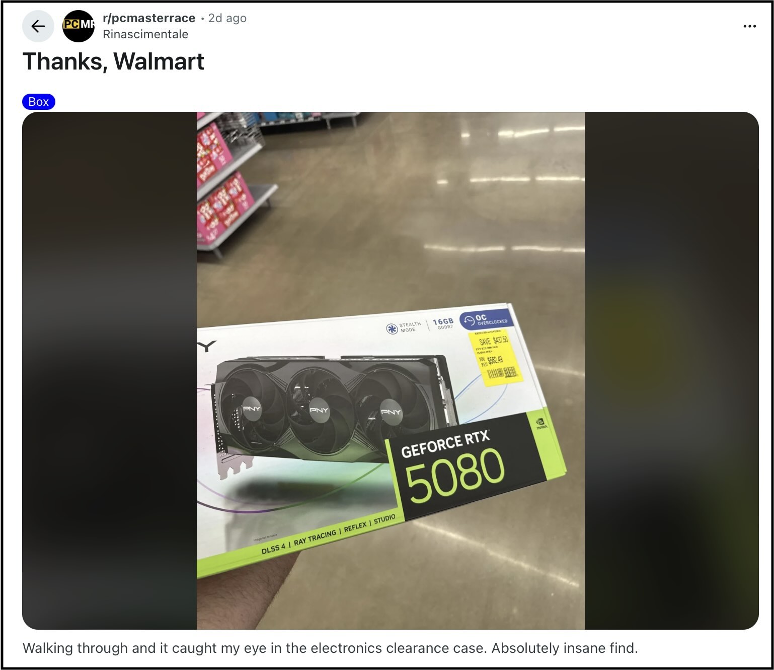 Men som vi har rapporterat om tidigare har ett stort antal entusiaster och spelare lyckats hitta chockerande bra erbjudanden på spelhårdvara, med tillstånd av sparsamhetsbutiker och utförsäljningar. En sådan spelare har till synes lyckats plocka upp ett PNY RTX 5080 triple-fan-kort för bara 562 $ på sin lokala Walmart, som de lyckades hitta i rensningsgången.