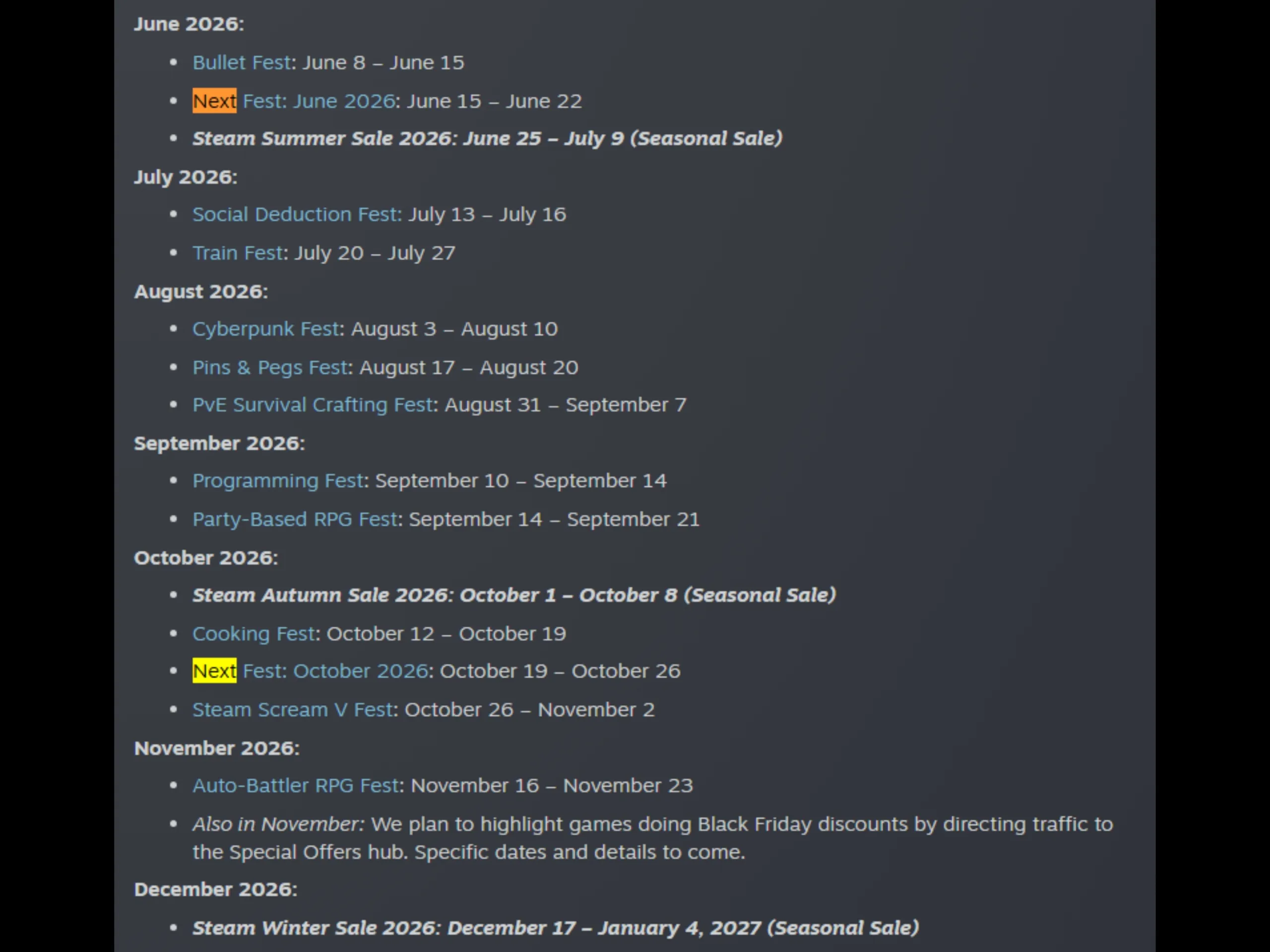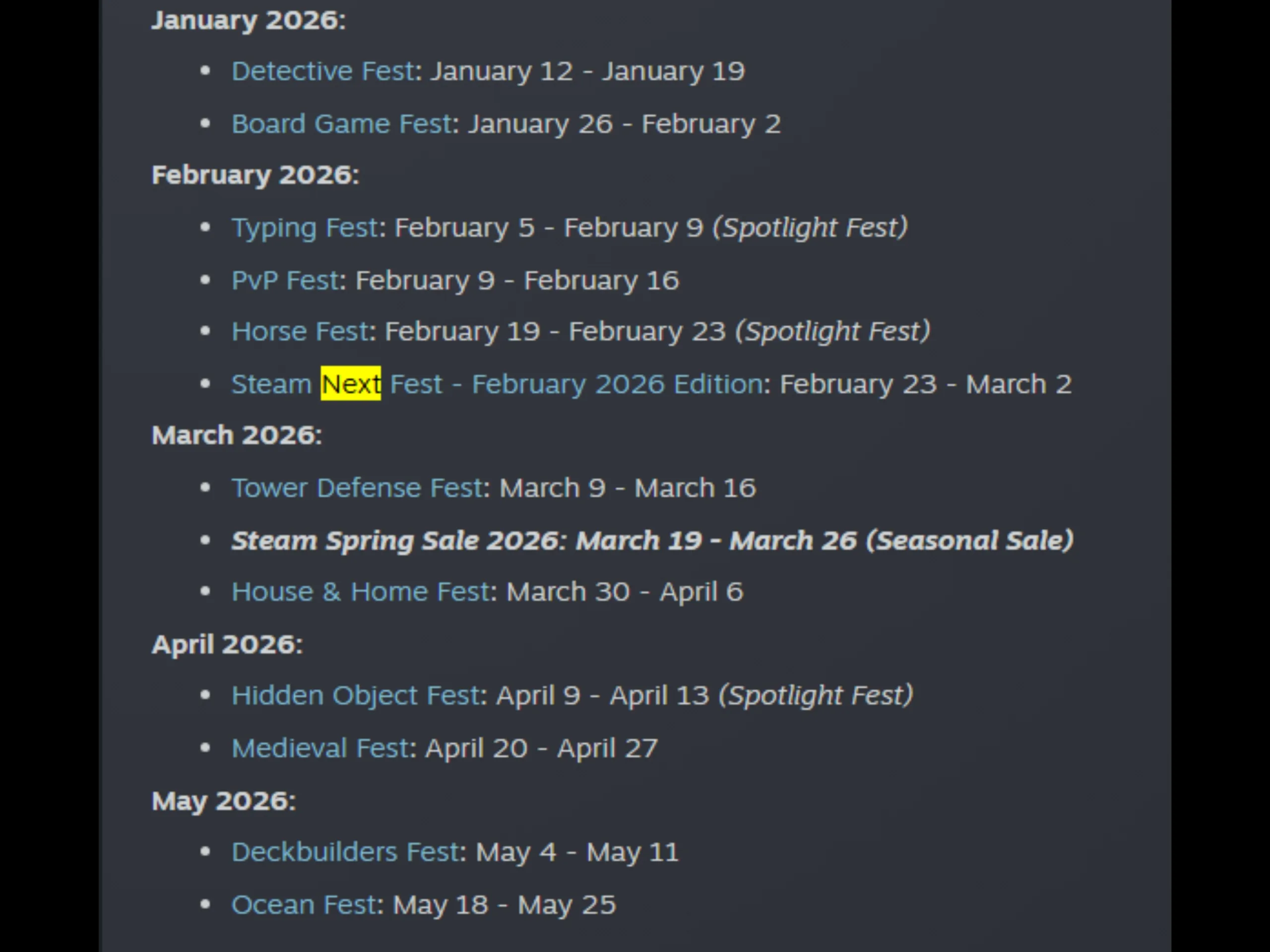 Förutom de fyra stora säsongsreorna, som innehåller rabatter på nästan alla genrer, anordnar Steam en mängd mindre temaevenemang under året som fokuserar på specifika kategorier. Till exempel startar Board Game Fest, som erbjuder erbjudanden på ett brett utbud av digitala brädspel, den 26 januari. Det följs i början av februari av Typing Fest, som fokuserar på tangentbordsbaserade spel. En annan höjdpunkt är Steam Next Fest, som återkommer tre gånger i år - i februari, juni och oktober. Till skillnad från andra evenemang fokuserar det inte på rabatter utan istället på gratis demos och förhandsvisningar av kommande titlar. En fullständig översikt över alla Steam-evenemang som planeras för 2026 finns nedan: