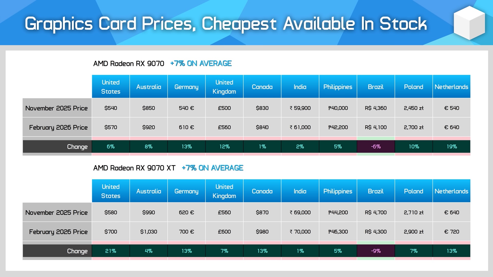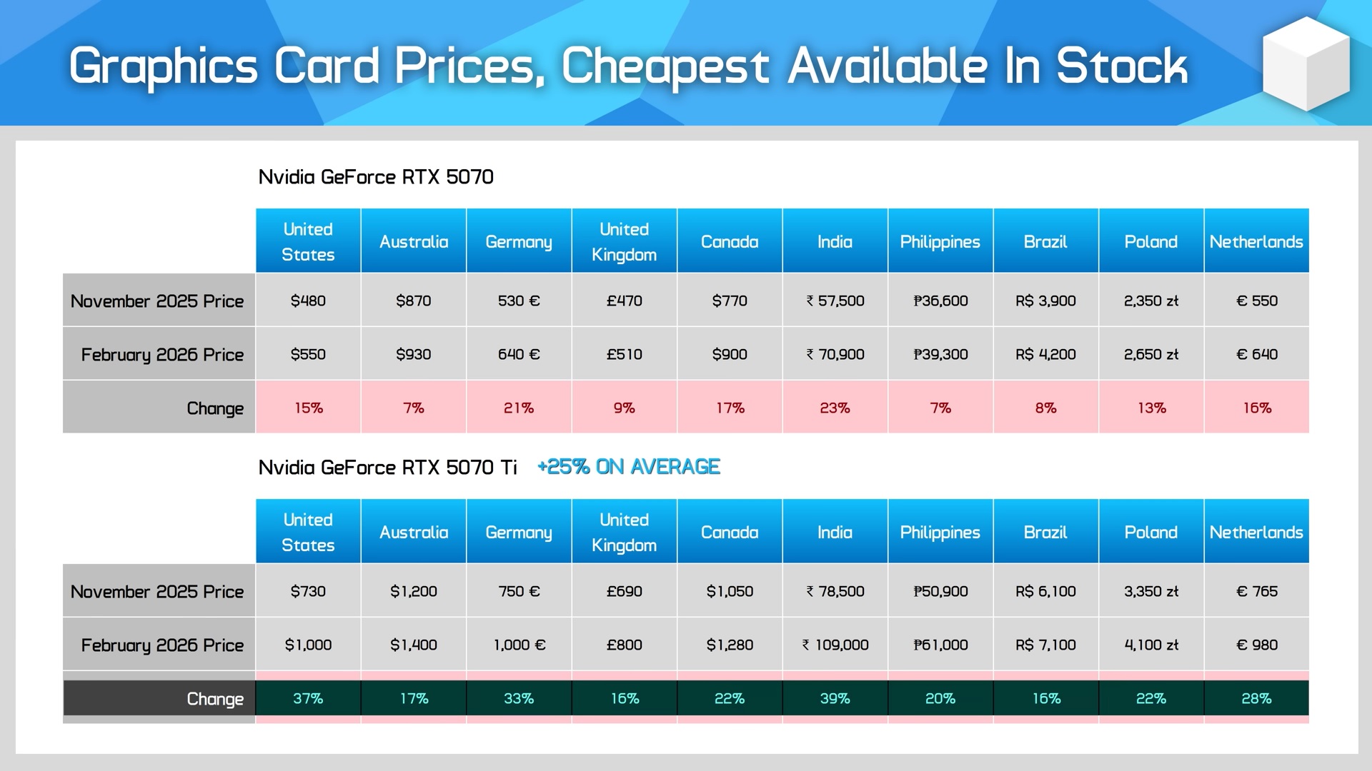 RTX 5070 Ti, som misstänks ha varit kraftigt utbudsbegränsad, kostar för närvarande i genomsnitt 25% mer i februari 2026 än vad den gjorde i november 2025 i de 10 regioner som HU tittade på. Dessa siffror ligger på 25% och 32% för RTX 5080 respektive RTX 5090. Det intressanta här är att RX 9070 XT, som direkt konkurrerar med RTX 5070 Ti, endast har registrerat en genomsnittlig prisökning på 7% sedan november 2025 globalt.