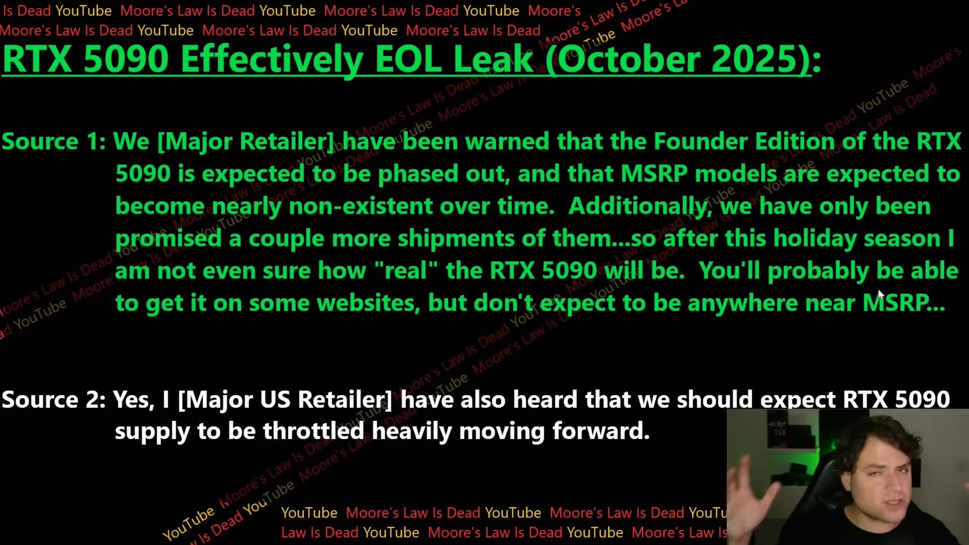 Enligt en MLID-källa som arbetar hos en "Major Retailer" förväntas RTX 5090 Founders Edition "fasas ut". Utbudet av andra MSRP-modeller verkar också minska till en punkt av obefintlighet. Källan varnade för att efter säsongen Holiday 2025 kommer de rimligt prissatta RTX 5090-modellerna, som de som säljs till eller närmare MSRP, troligen att vara ur omlopp.