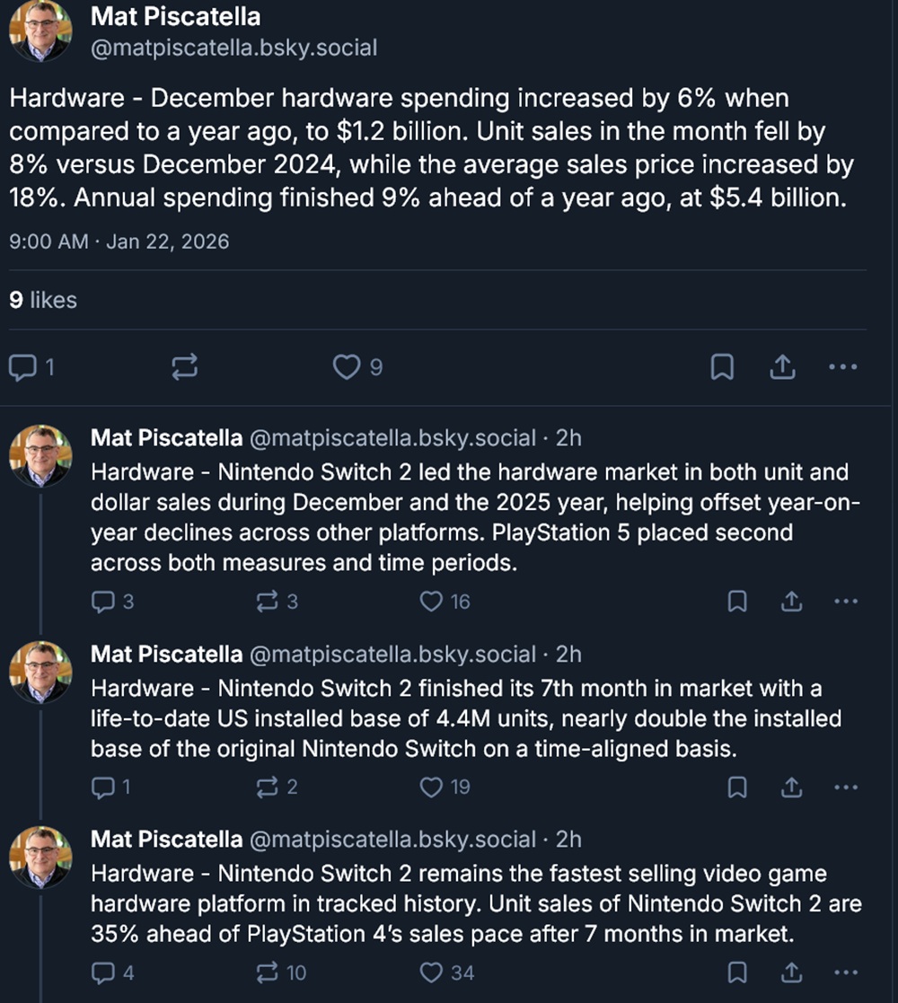 Efter tecken på en avmattningåterhämtade sig försäljningen av Switch 2 och slutade 2025 som det dominerande spelsystemet. December Circana U.S. data visar att den handhållna konsolen fortfarande är den snabbast säljande konsolen i historien. Efter 7 månader på marknaden ligger Nintendos hårdvara bekvämt före den takt som Switch och PS4 har satt.