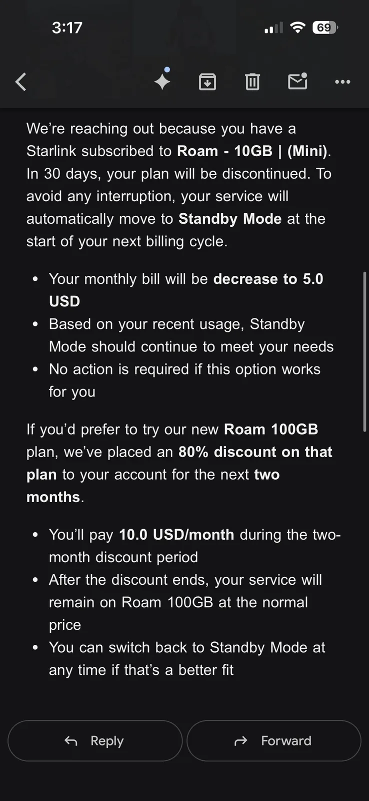 Förutom $ 10-planen upphörde Starlink också nyligen att erbjuda 40 dollar/månad alternativet som var dess billigaste Residential-plan och flyttade det till Roam men endast för vissa användare. Det togs därefter bort helt och hållet, medan Starlink fördubblades starlink fördubblade den grundläggande datatilldelningen för roaming på 50 USD/månad och sänkte priset för Mini parabol med 20% som kompensation.