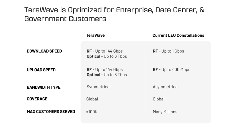 Jeff Bezos Blue Origin har tillkännagivit TeraWave, ett satellitbaserat internetnätverk som är utformat för att leverera upp till 6 terabyte per sekund symmetrisk bandbredd och som riktar sig direkt till företag, datacenter och myndigheter. Till skillnad från Starlinksom betjänar miljontals enskilda användare, riktar sig TeraWave till en mycket mindre kundbas.