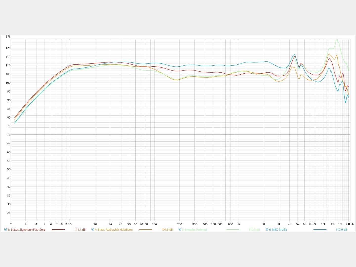 För en mer objektiv analys gjorde vi några mätningar med miniDSP EARS-systemet i kombination med analysprogrammet Room EQ Wizard (REW), som du kan se nedan. Resultaten var återigen utmärkta. Med fabriksinställningen "Status Signature" framhävdes basen, med något svagare mellanregister och välrepresenterade höga toner. Starka och oönskade resonanser uppträder dock vid 4,5 kHz, 5,6 kHz och över 10 kHz. Med en anpassad EQ kan man komma nära idealvärdena. De flesta användare kommer att vara mer än nöjda med standard-EQ:n, men entusiasterna kommer att glädjas åt att det finns ännu mer potential i Status Pro X.