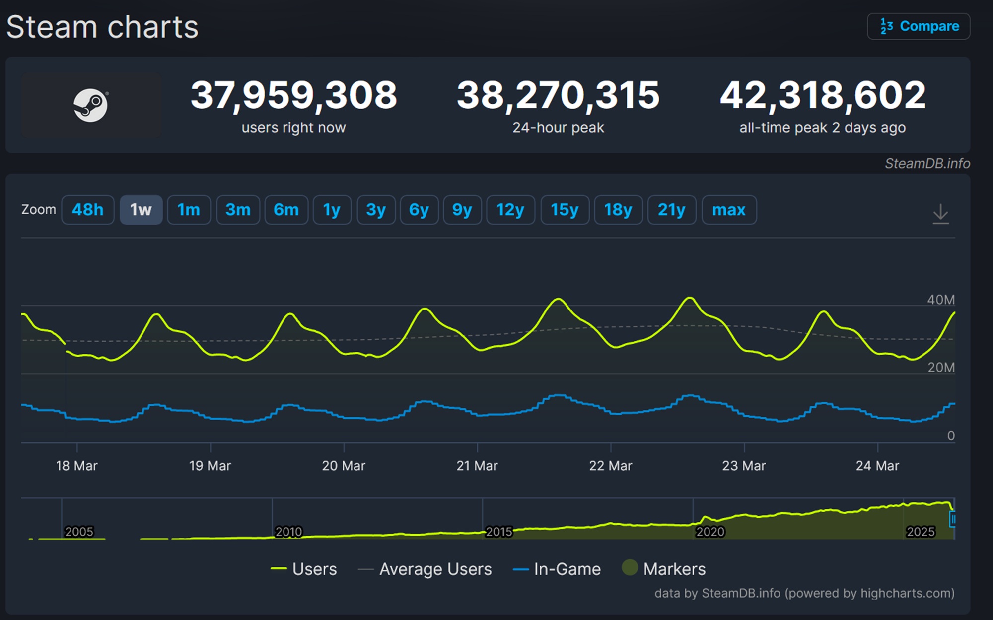 Det verkar som att Valve varje månad sätter ett nytt högvattenmärke för att bekräfta sin dominans. Marknadsplatsens senaste prestation är att toppa sin tidigare högsta samtidiga användarantalet på över 42 miljoner i januari. Med den senaste Crimson Desert släppdatum som en faktor steg det numret till 42.3 miljoner den 22 mars.