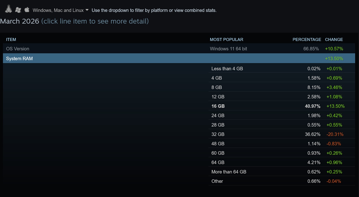 Med 40,97% har alternativet som inkluderar 16 GB DDR4- och DDR5 RAM-minnen återtagit förstaplatsen i Steam-undersökningen. 32 GB-alternativet ligger nu på 36,62%, eftersom spelare kämpar med uppblåsta minnespriser.