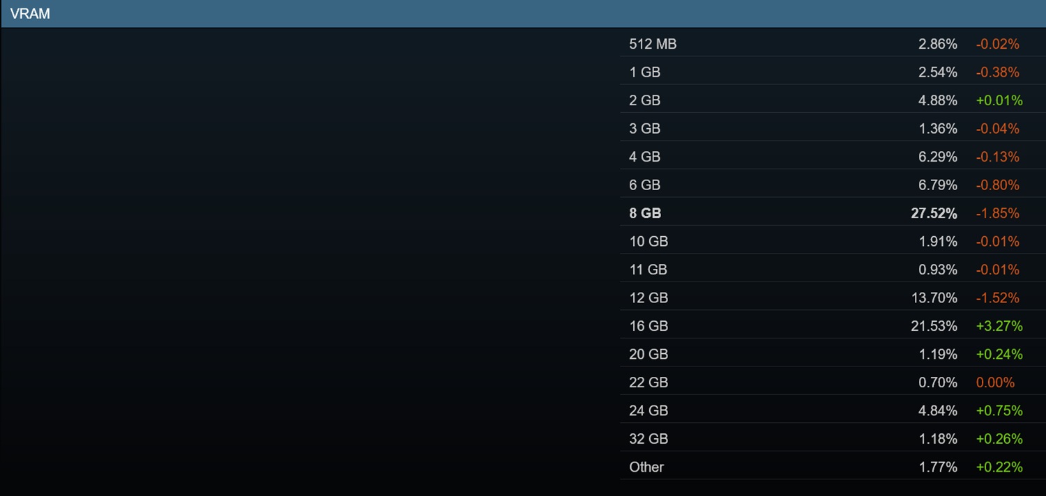 Den ansträngda komponentförsörjningen påverkar inte annan hårdvara på samma sätt. Grafikkort med 16 GB VRAM ökade med 3,27%, vilket förde deras totala andel till 21,53%. GPU:er med 8 GB VRAM är fortfarande mer vanligt förekommande, men minskade med 1,85%. Minnesbristen har gjort det dyrare att erbjuda högre kapacitet. Ändå har köparna mindre flexibilitet att uppgradera dessa delar än de har med systemets RAM.
