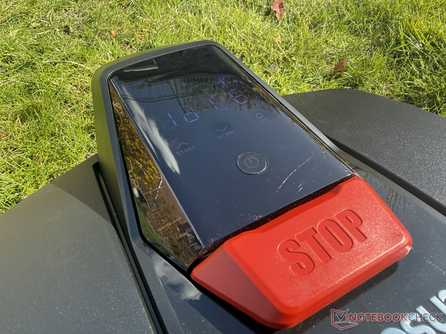 Sunseeker lovar också särskilt enkel drift. Detta är också en given. Sunseeker V1 kan användas helt utan app. Förutom en liten display har den prisvärda robotgräsklipparen fem knappar/beröringsytor för stopp, på/av, start/upp, hem/ner och inställningar/ok. Den manuella justeringen av klipphöjden är placerad på baksidan. För detta ändamål är ett roterande hjul installerat på ovansidan, från vilket ett litet handtag kan fällas ut för enklare användning.